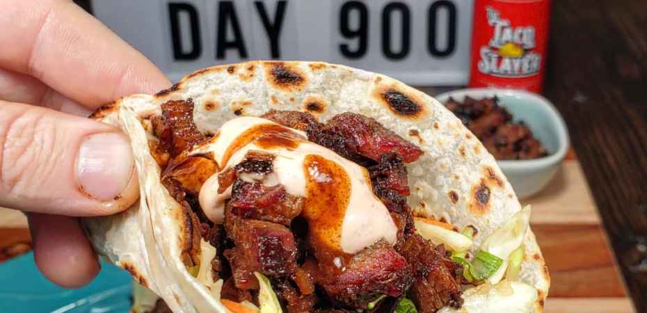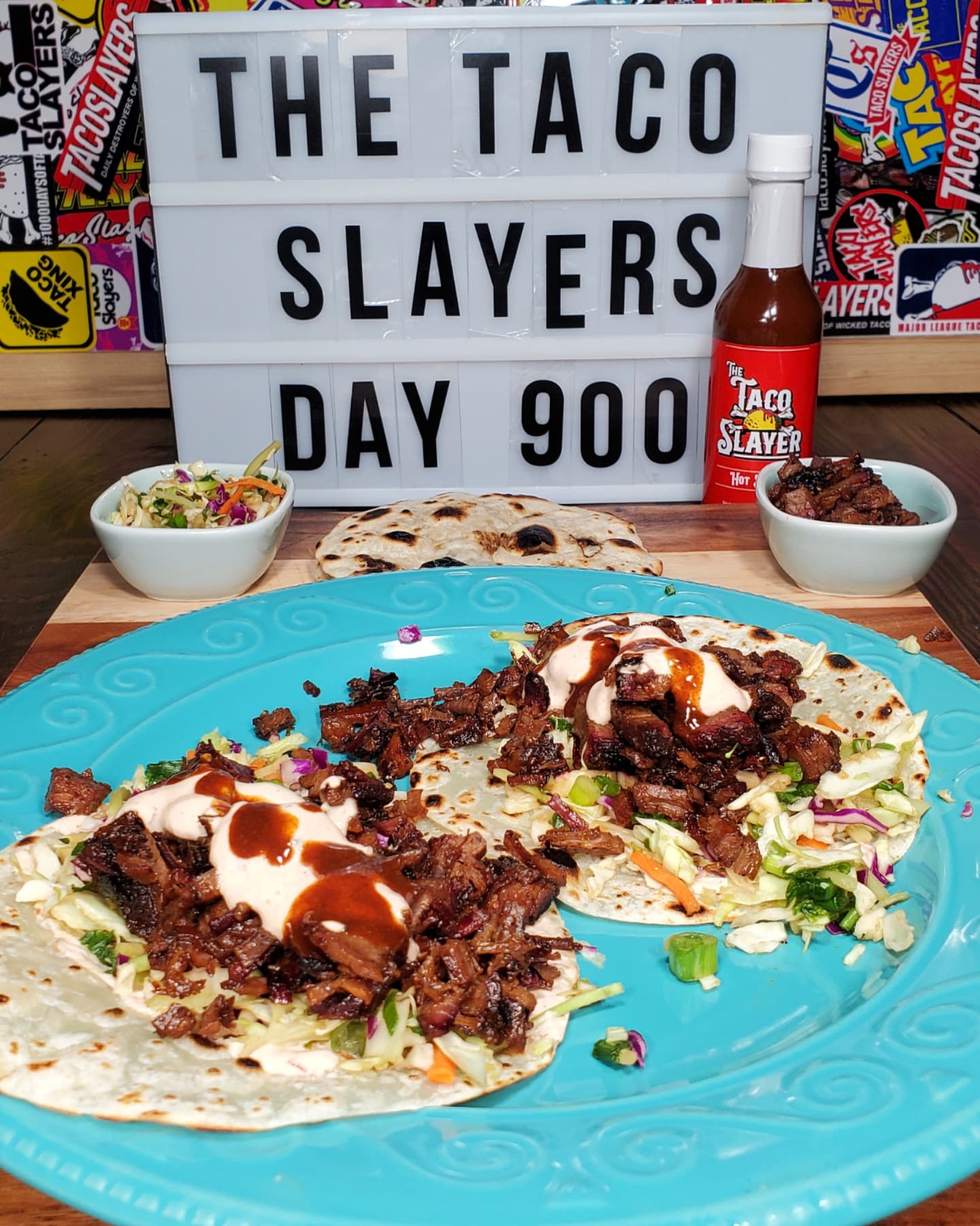 Ladies and gentlemen, we are in the final stretch of this 1000 day journey into the deliciously unknown. For day 900 we kept it low key and cooked up the rest if our brisket with some wicked @soyvay sweetness. The beef sat over a cabbage/broccoli/ citrus slaw with a @melindasfoods Sriracha cream sauce. Naturally, I doused the surface of these tacos in the TacoSlayer trinidad scorpian Hot sauce.
