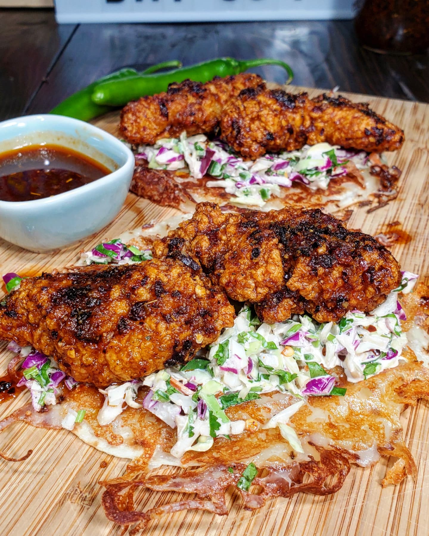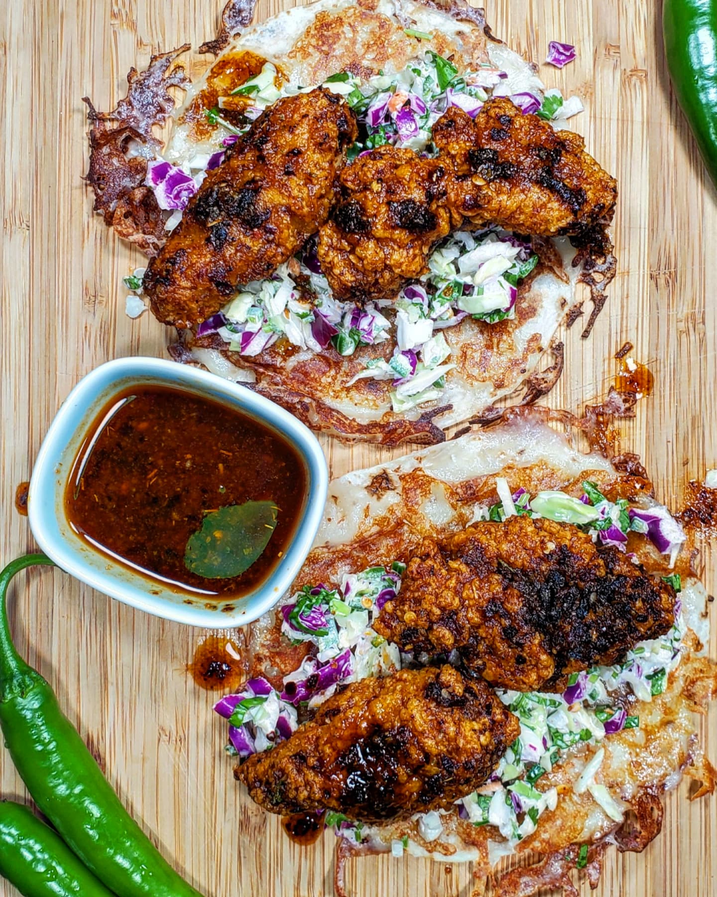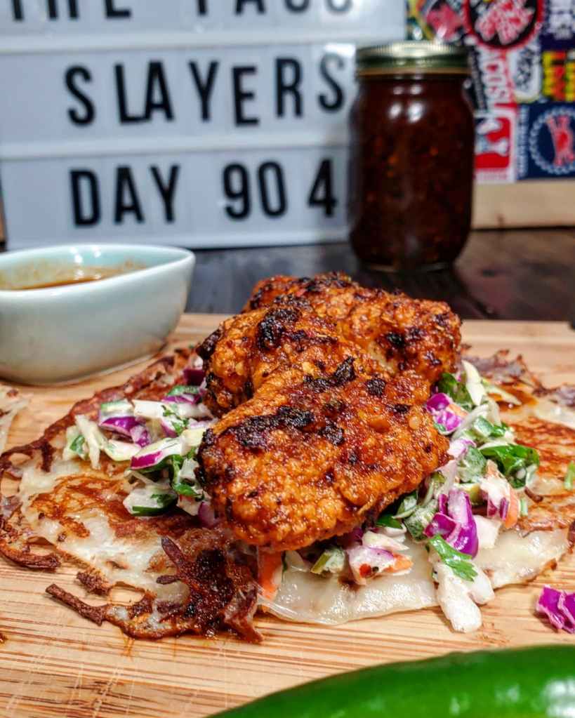 Each taco was made with a flour tortilla with a crispy cheese crust and a pile of serrano cabbage slaw followed by the dipped chicken.
