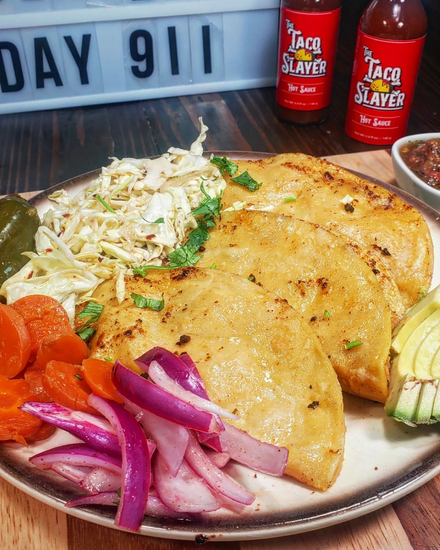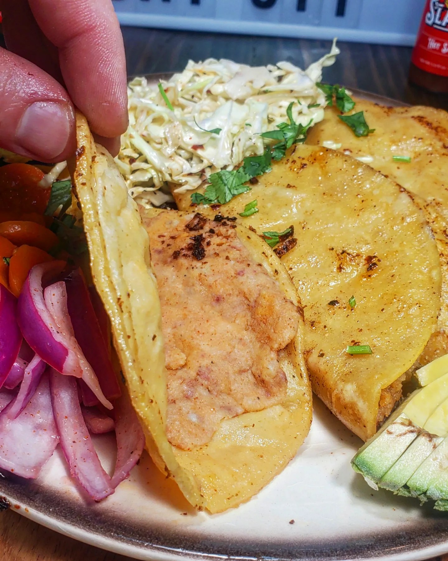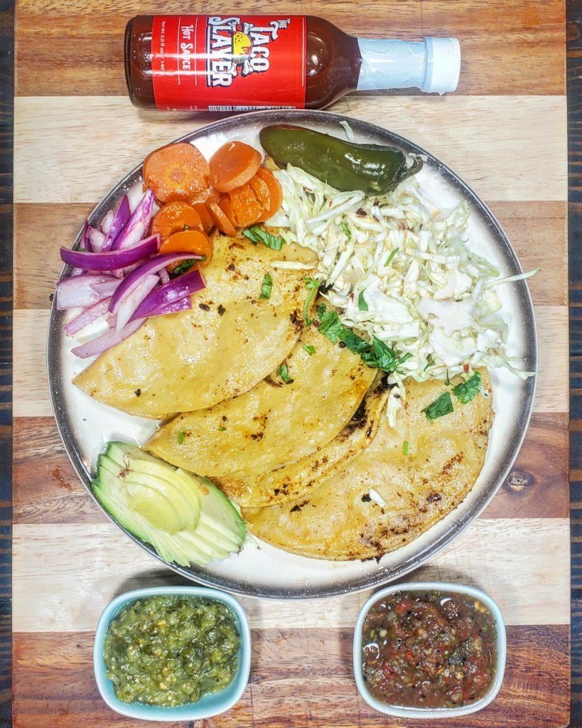 Corn tortillas with the mixture and placed them in an aluminum/ butcher paper lined basked with onions and a hot oil. After filling the basket up I sealed it off and let the tacos enjoy the sauna while I prepped cabbage, red onions and salsas. I also popped open a can of pickled jalapenos and carrots to level up these tacos.