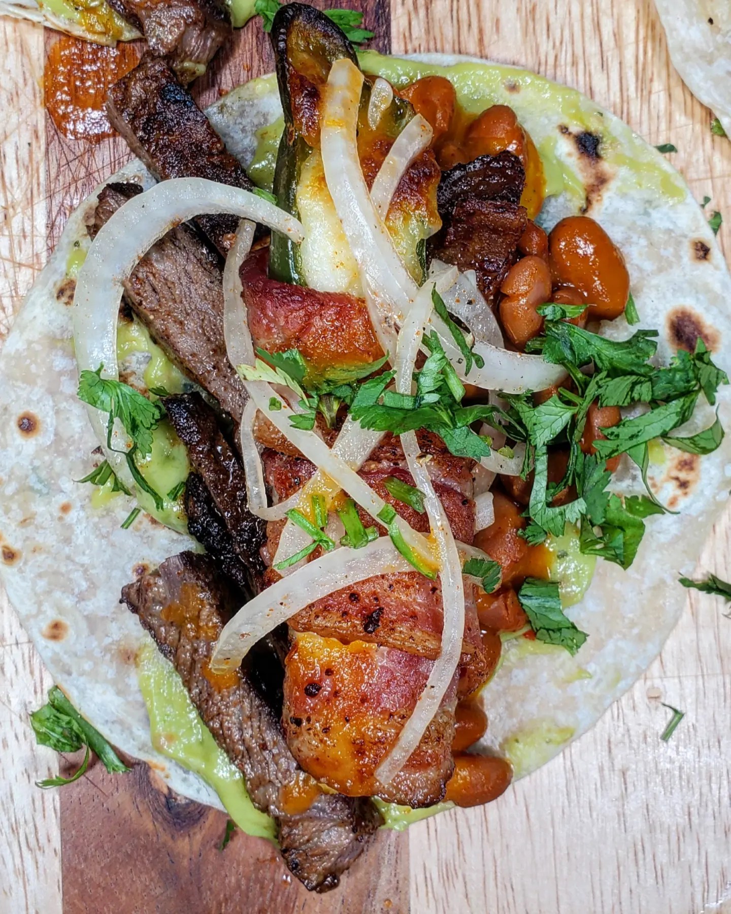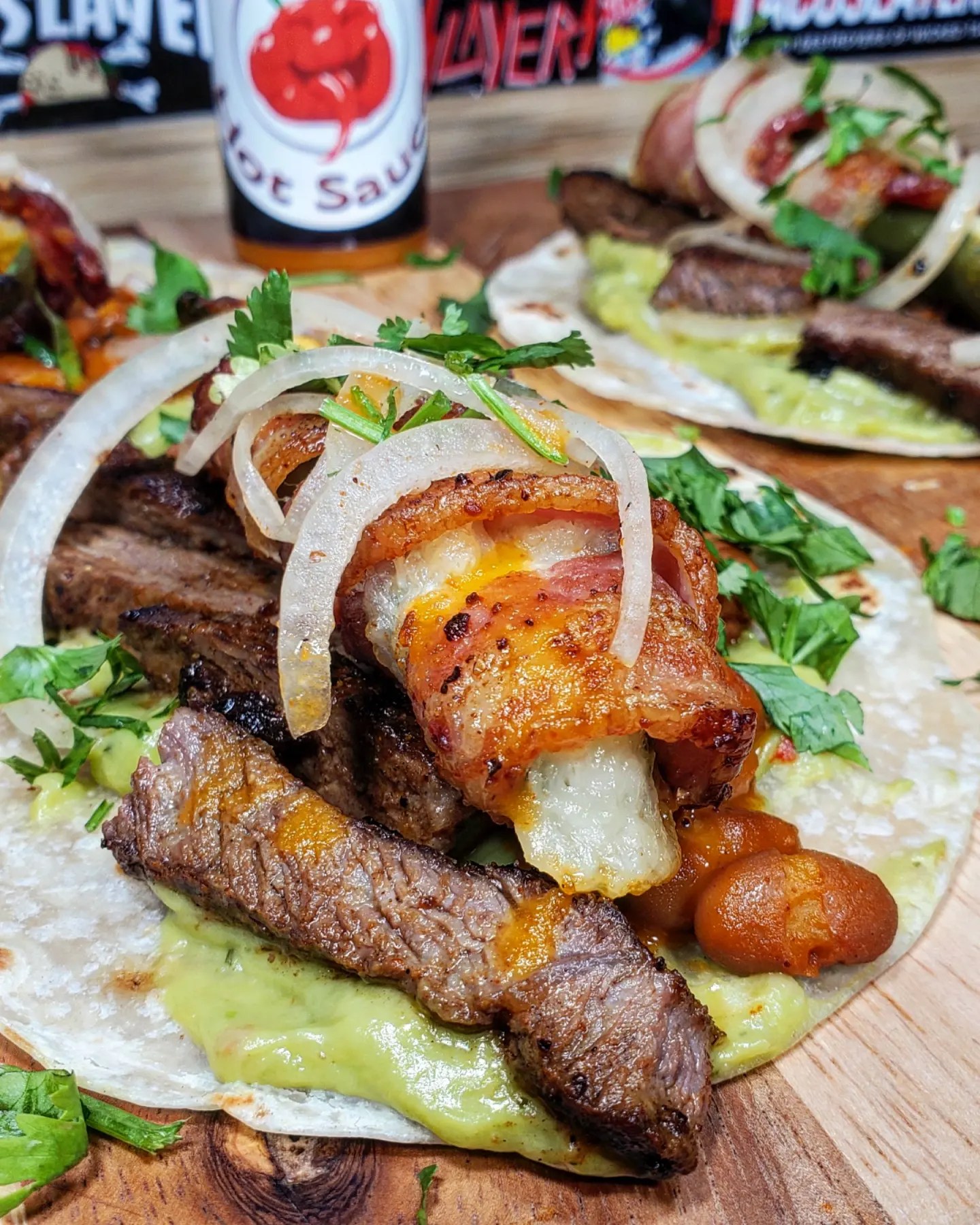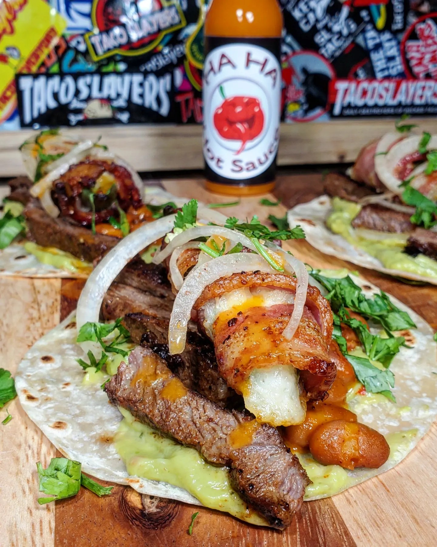 This taco started off with a few seasoned new york steaks chopped up and piled into a few guacamole lined flour tortillas. Next I scooped in beans and placed in a bacon wrapped and queso stuffed jalapeno before topping it off with sliced onions and cilantro. For the grand finale I drizzled in massive amounts of the pear, orange, apple cider vinegar and carolina reaper flavors of HAHA hotsauce and holy smokes!!! 😋 TacoPerfection!