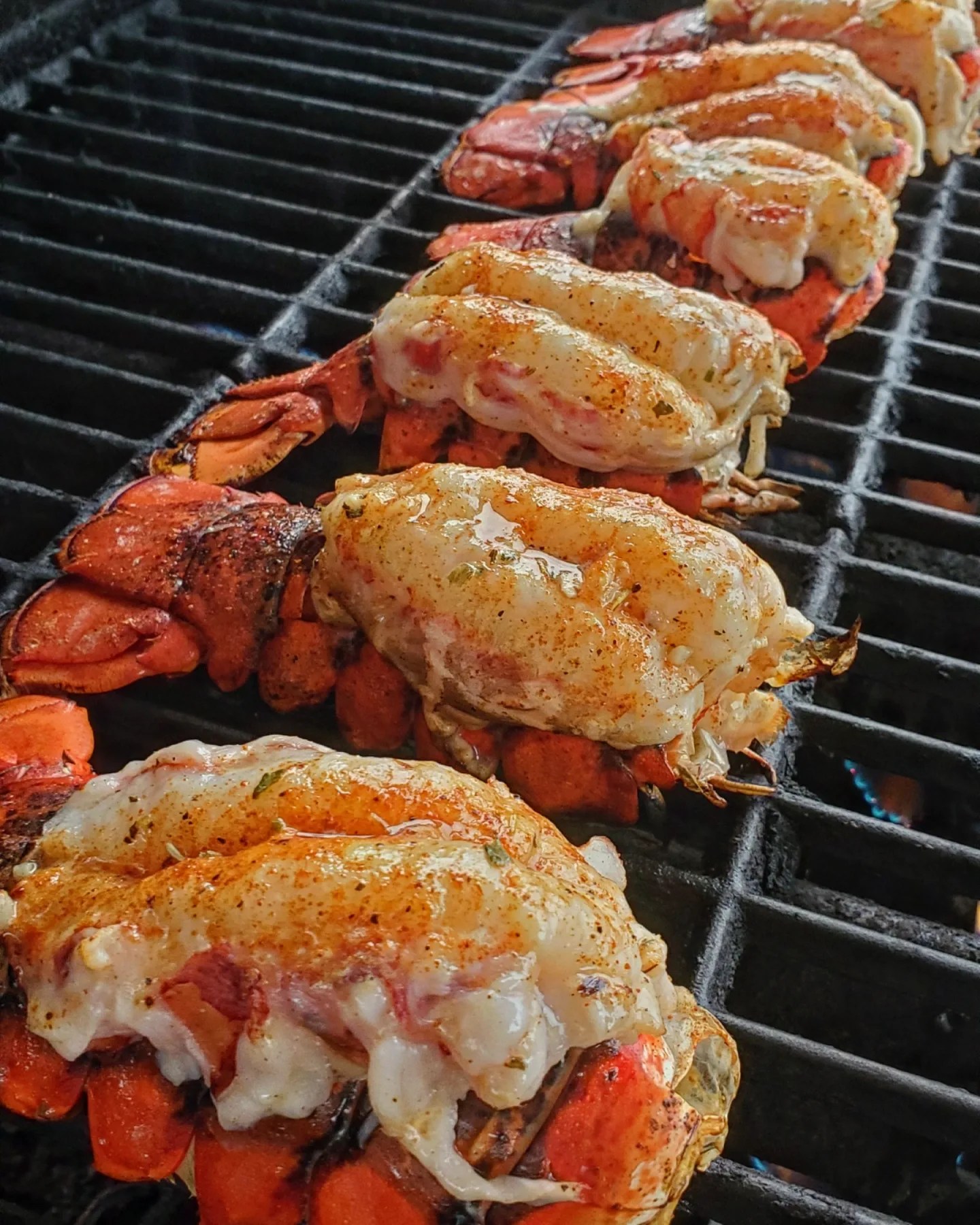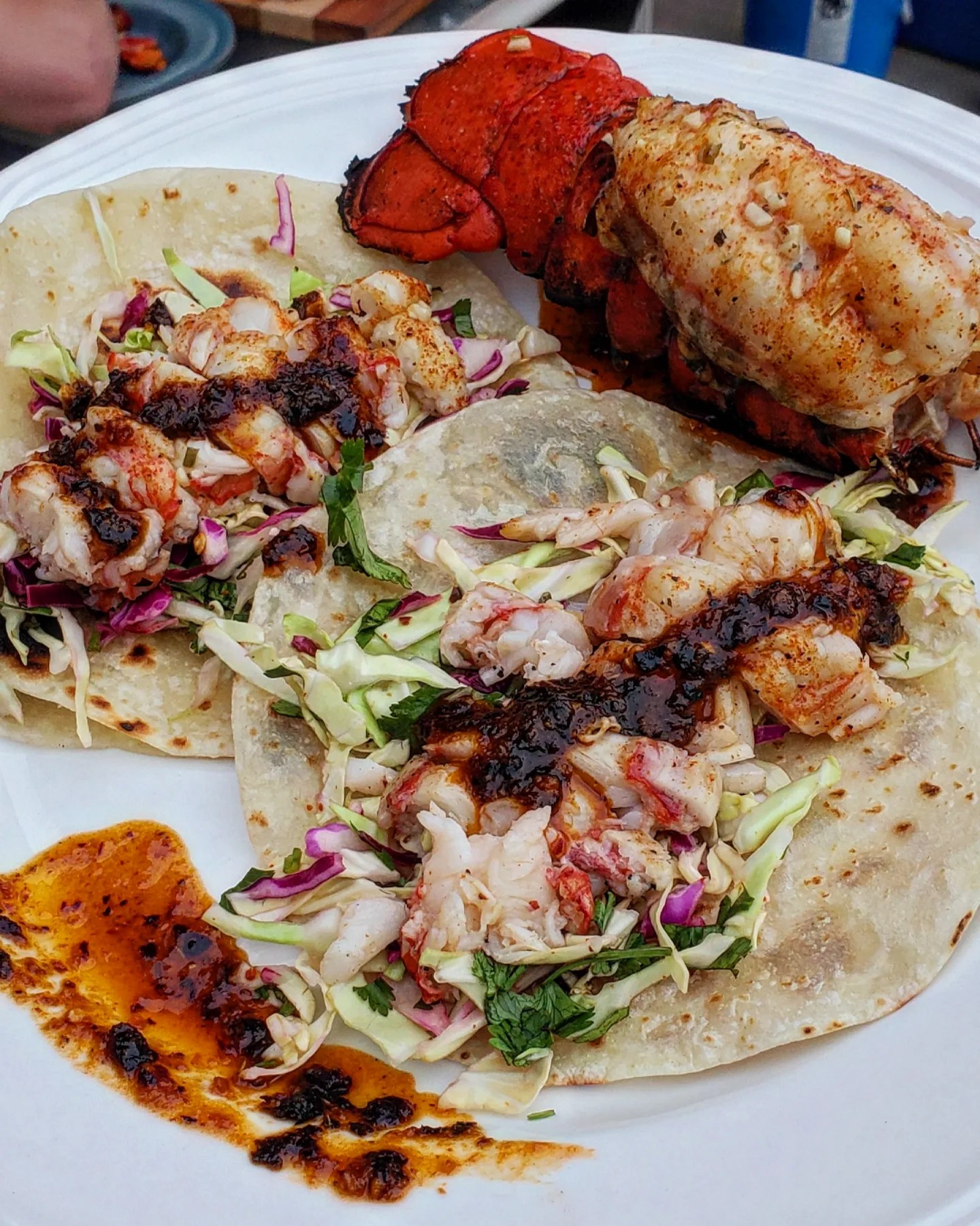 After a buttery grill session we pull the meat out of the shell, chop it up and place it on a cabbage/cilantro slaw mount trapped inside a @caram3lo tortilla. Over the lobster meat a scooped in some homemade salsa macha and SLAYED!