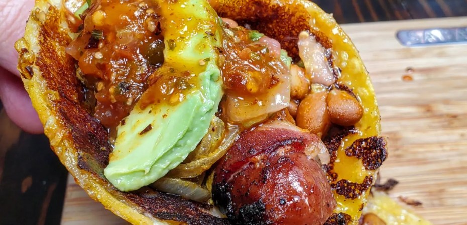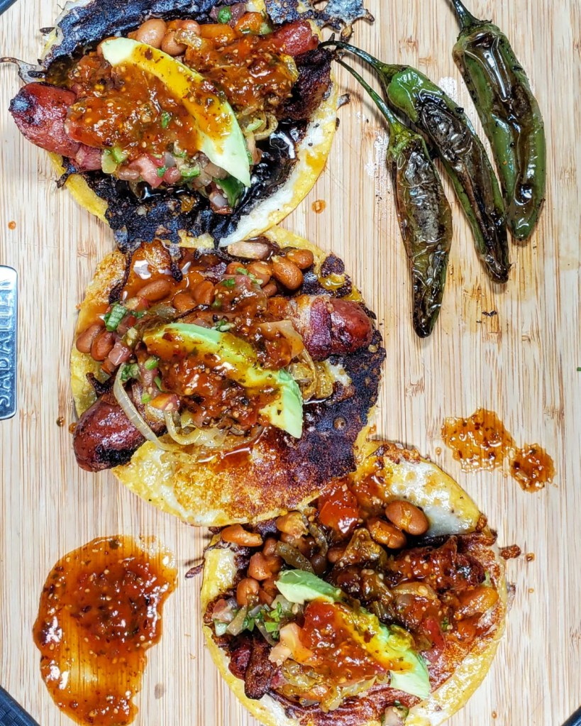 With everything completed, I warmed up a few corn tortillas and melted some cheese on top of each one. Next I piled in the bacon wrapped hotdogs and on 1 side I placed the beans and on the other I placed the onions. With a little pico de gallo, a slice of an avocado, a few scoops of the super tasty @fontovamexicanfoods Salsa Taquera and these tacos were ready to be slayed.