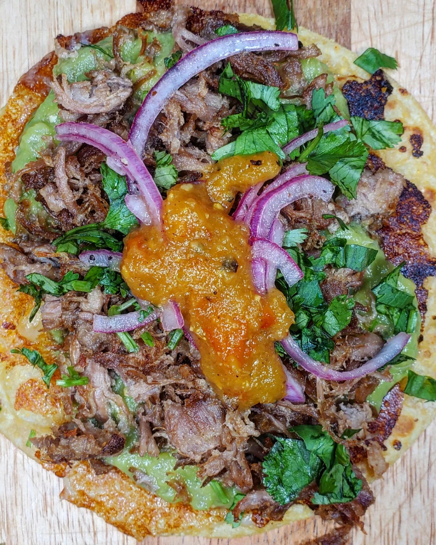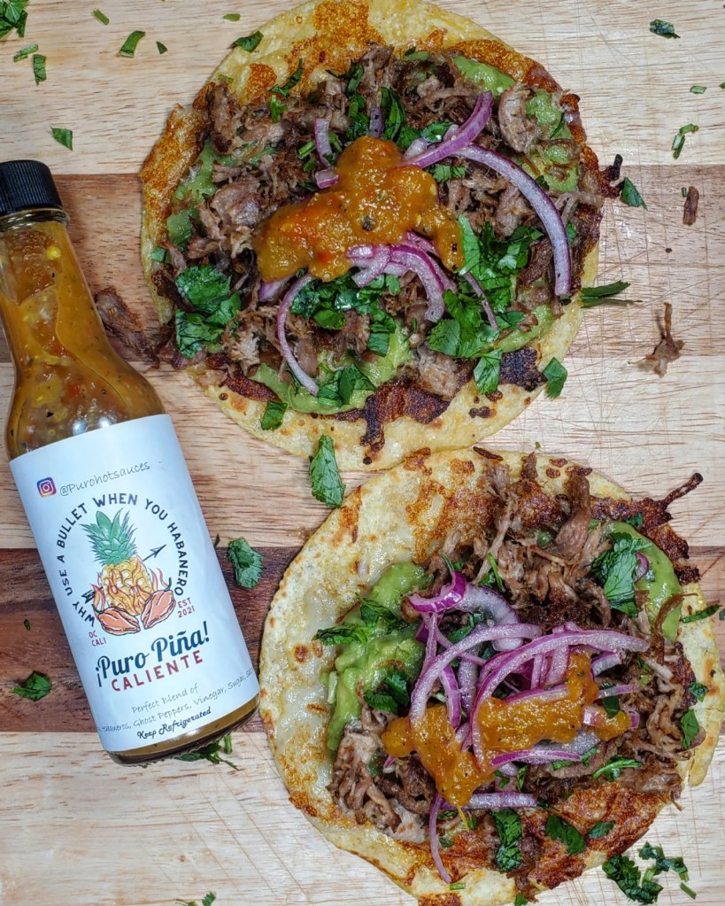 After the slow cook I piled shredded pork onto a cheese crusted flour/corn hybrid tortilla with a solid scoop of guacamole and topped with cilantro and pickled red onions. Lastly, I drizzled on the extra hot and extra delicious Puro Pina Caliente over the top and began the slay.