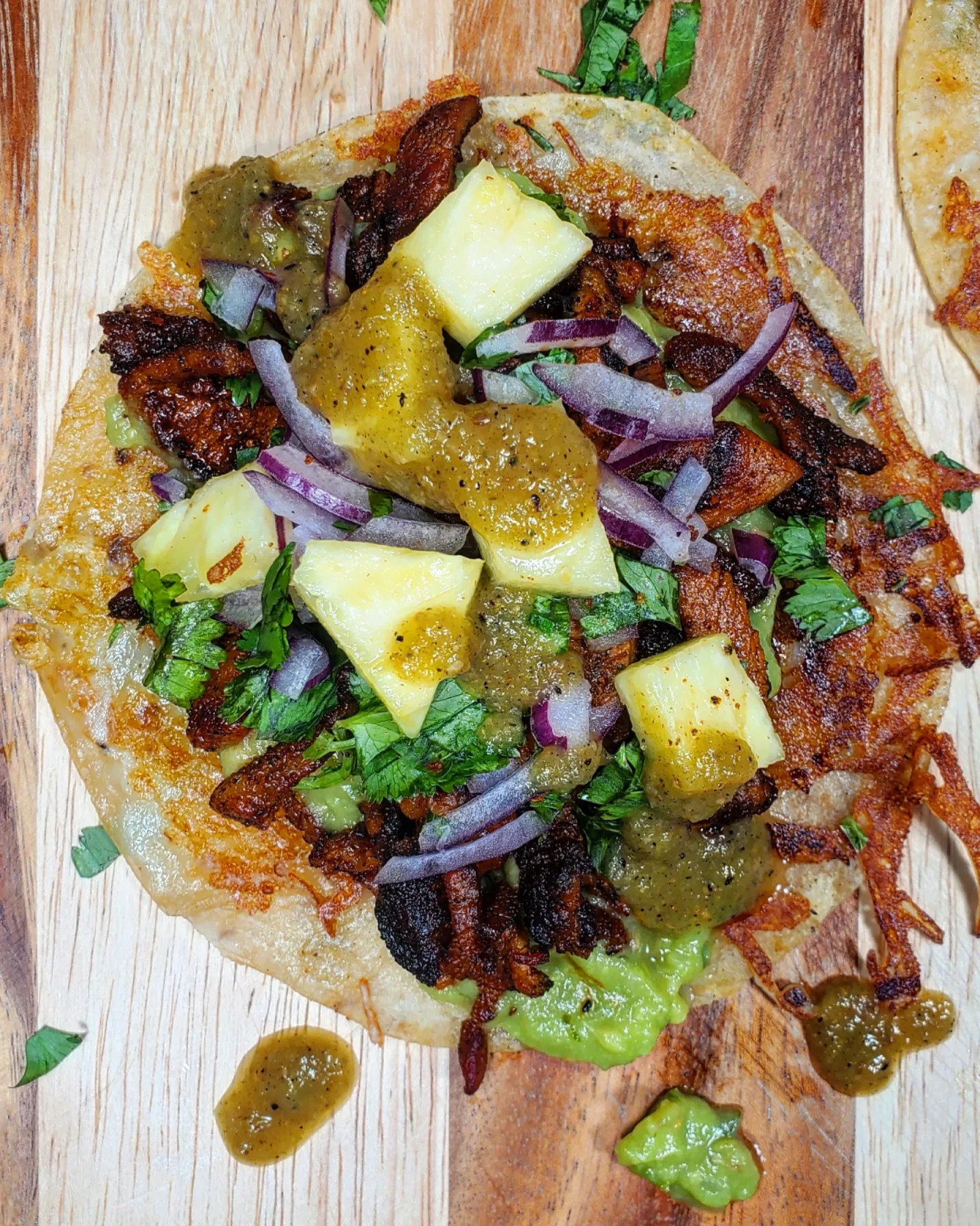The vessel of this taco is a perfectly made flour tortilla from the Mama Liche Tortillaria. Upon that tortilla sits a sheet of melted and crust cheese followed by a blanket of guacamole. On top of the Avocado concoction rests a heaping mound of fire grilled adobada meat and is then topped in onions, cilantro, and pineapple fresh pineapple chunks.