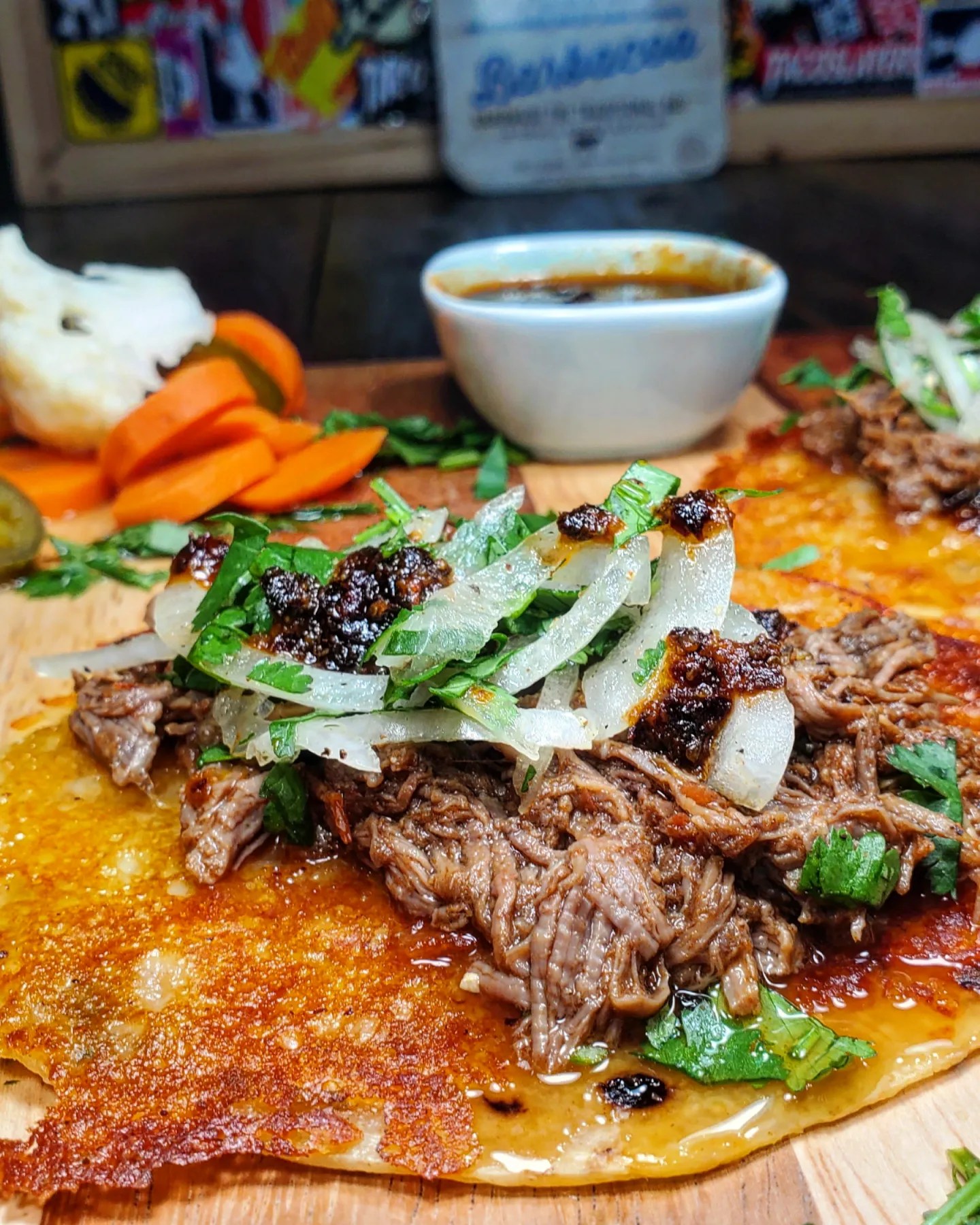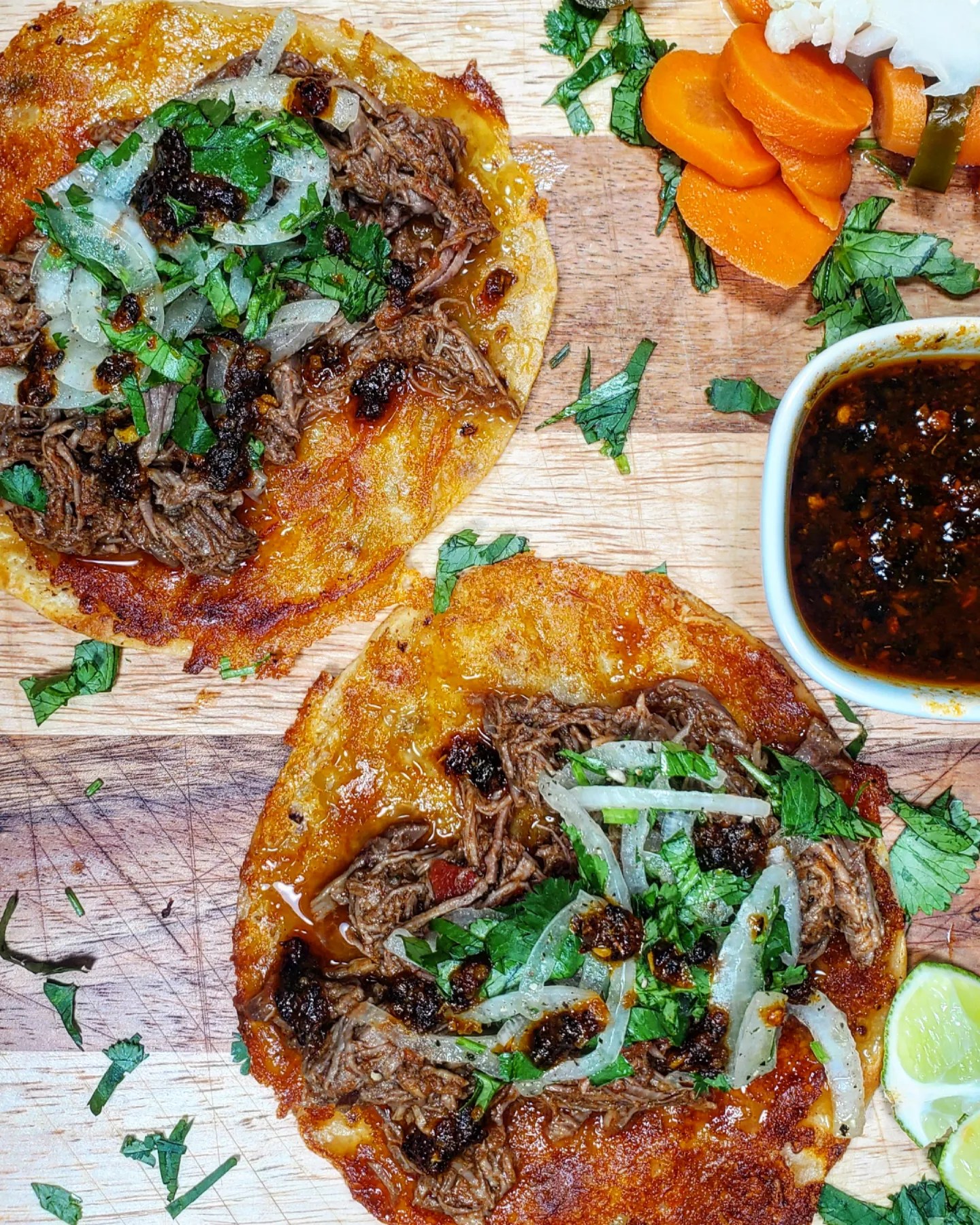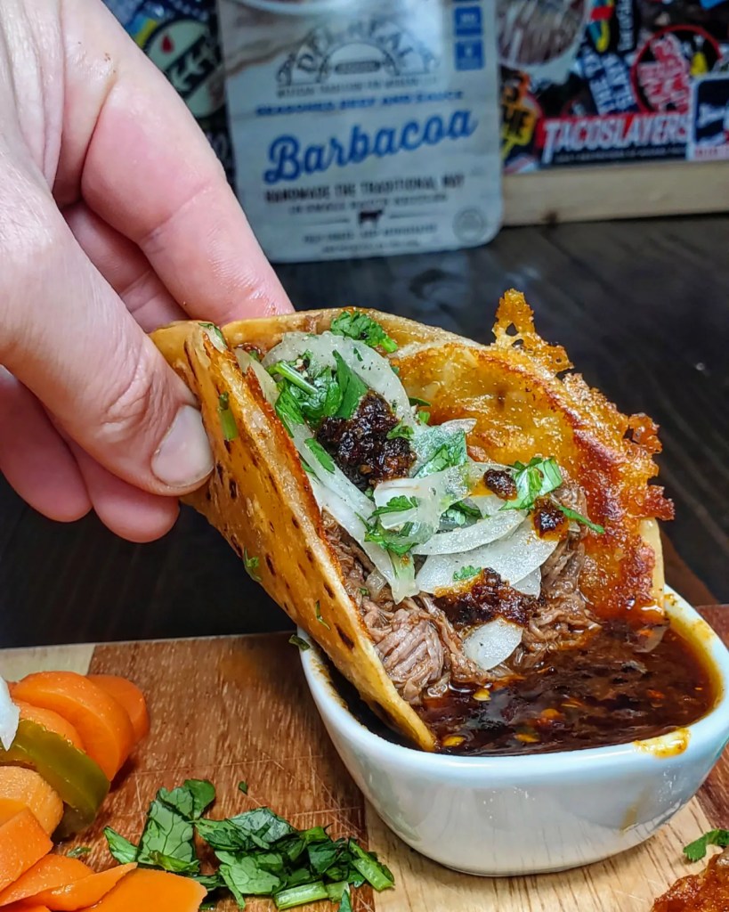 After the meat was heated I placed it into a queso crusted flour tortilla with a handful of cilantro and onions with a little drizzling of a homemade salsa macha. Sooooo tasty.