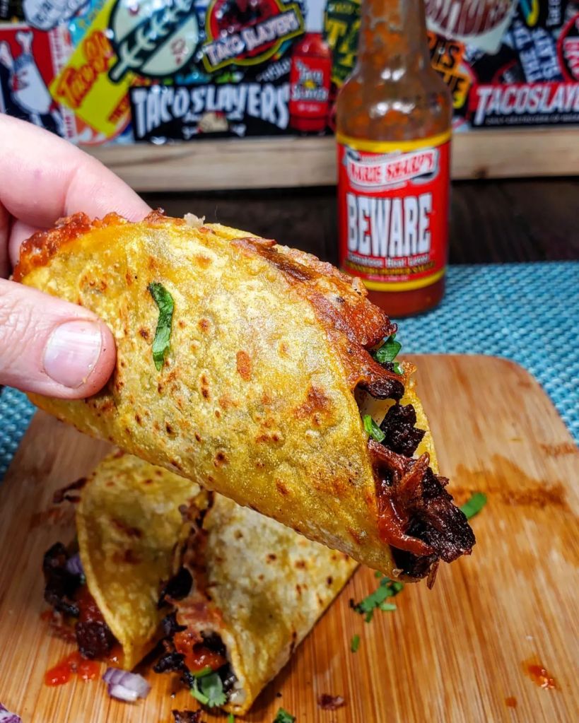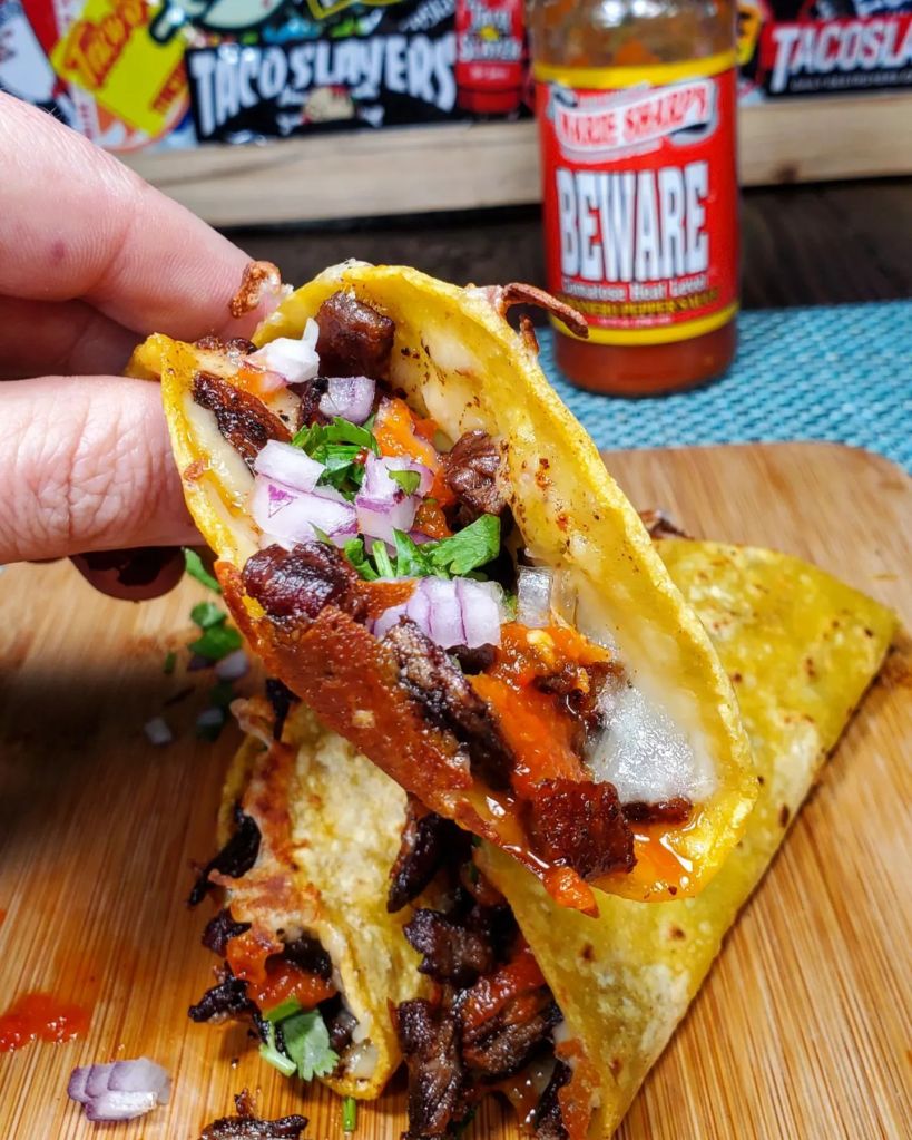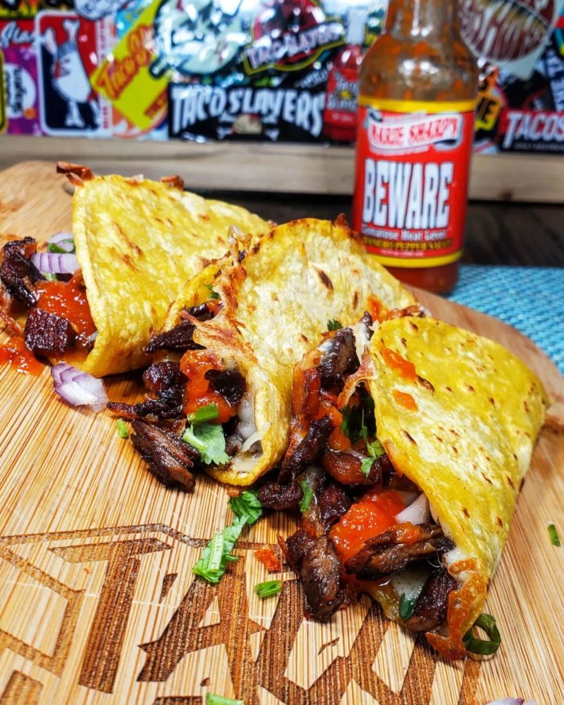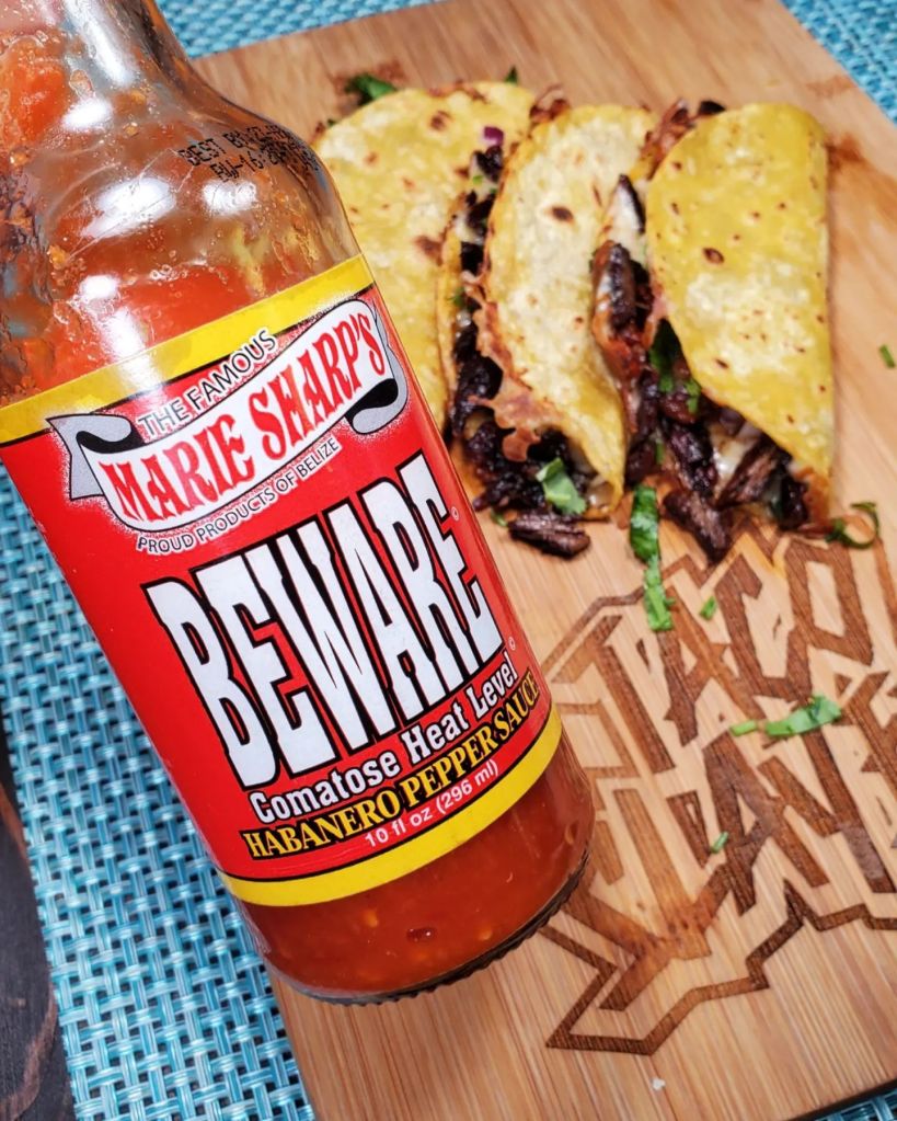 Last night we made the most of our left over carne asada by stuffing in inside a couple corn tortillas that had been previously stuffed melted cheese. Along for the ride with the meat was cilantro and onion and a few drops of @mariesharpsusa BEWARE habanero sauce.