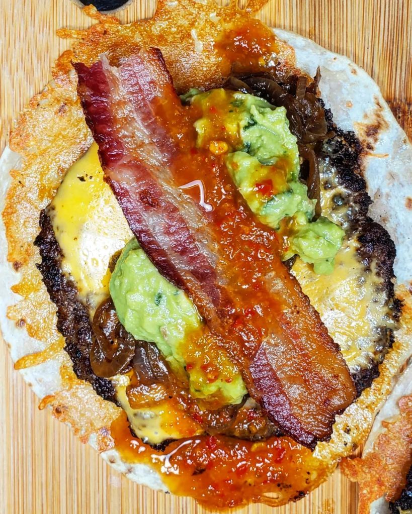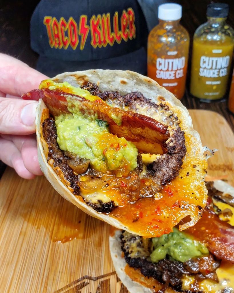 In another skillet I readied up a flour tortilla and melted then crisped some Mozzarella cheese to it surface. Next I placed in the ground beef patty followed by a very generous helping of onions, a couple scoops of guacamole and a strip of bacon. I finished these tacos off with huge drizzling of @cutinosauce Ghost to crank the heat up.