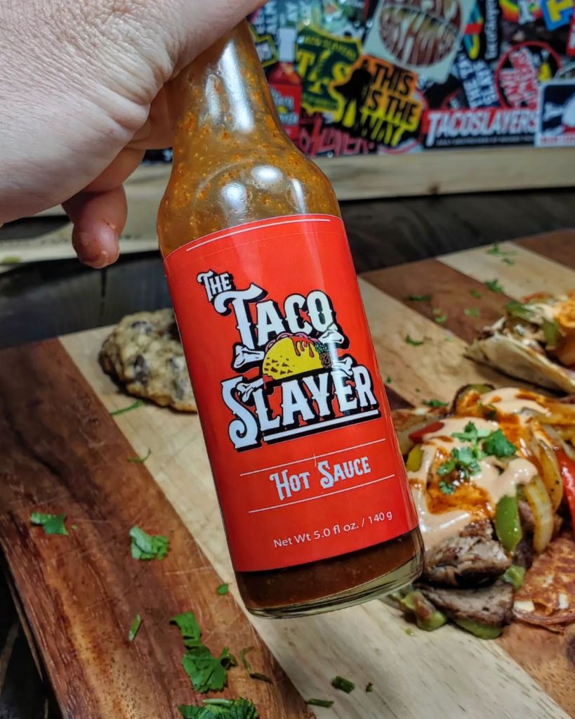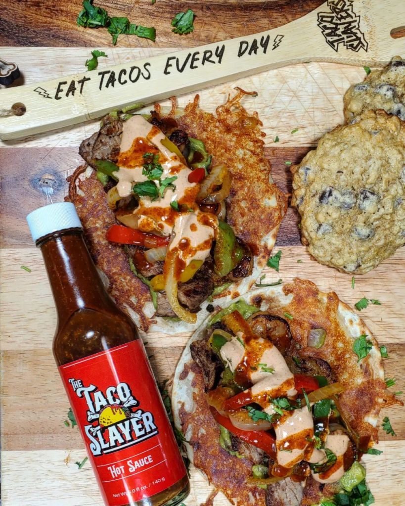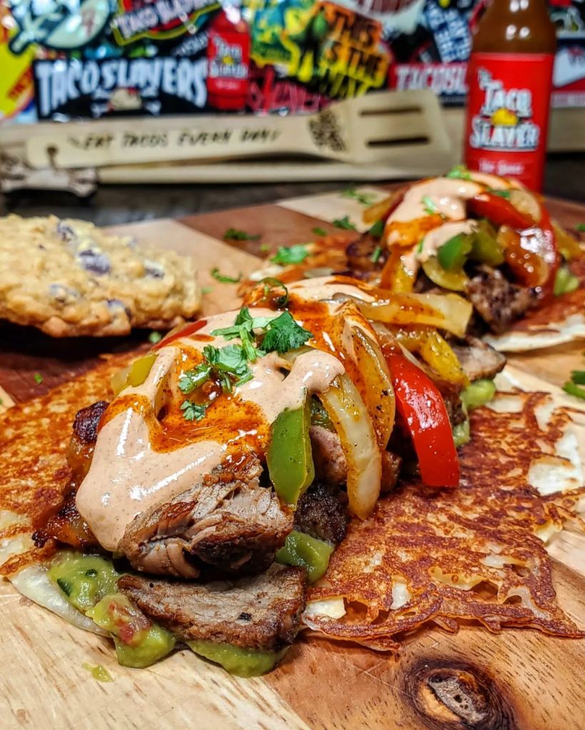 Each flour tortilla recieved a coating of crispy mozzarella cheese a scoop of @yucatanguac and I added the meat in. Next I piled in some grilled bell peppers and onions followed by the spicy cream and copious amounts of our own TacoSlayer Hot Sauce from @shakasauce