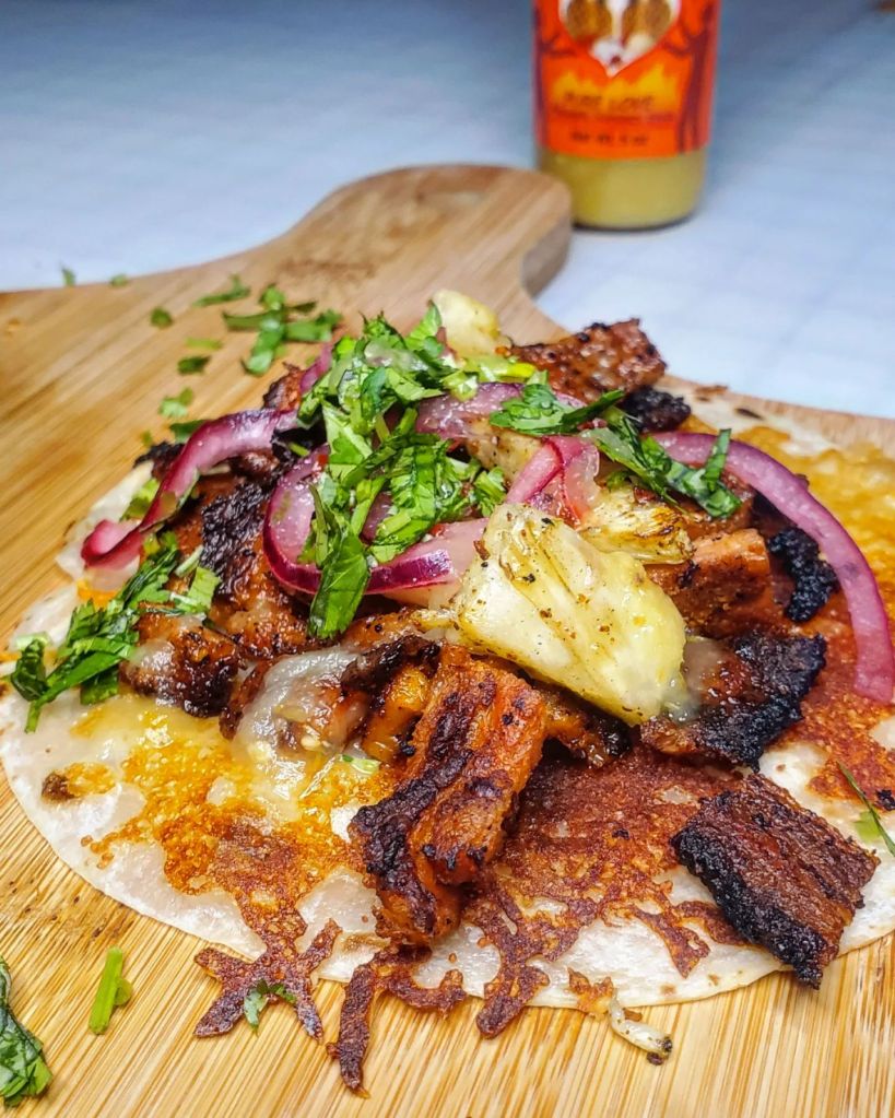 At home I grilled up the seasoned pork meat over my @charbroilgrills along with a few slices of pineapple. Once the adobada and pineapples were ready I fixed up a few cheesed up flour tortillas and piled everything in.