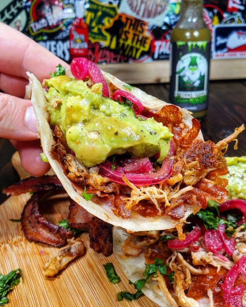 Next I melted a little Oaxaca queso to a flour tortilla and scooped in the pork followed by a little cilantro and a huge helping of lime soaked red onions before being straddled by a mound of guacamole. I finished these tacos off with a drizzling of the tasty ” green munster” verde hot sauce from @infernofarms!!
