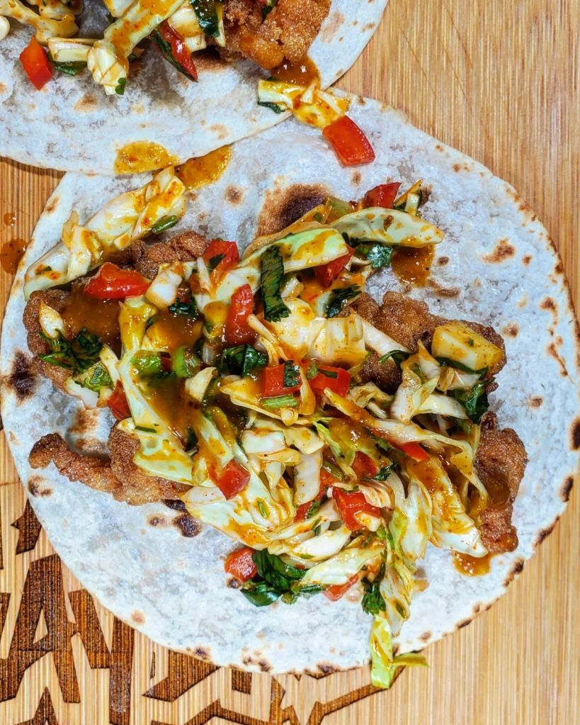 After seasoning and coating up a few pieces of cod I dropped them into a little hot oil and fried them up till crispy. Next I chopped and mixed up some cabbage, cilantro, red bell peppers and green onion with a little kimichi mayo to pair with the fried fish.