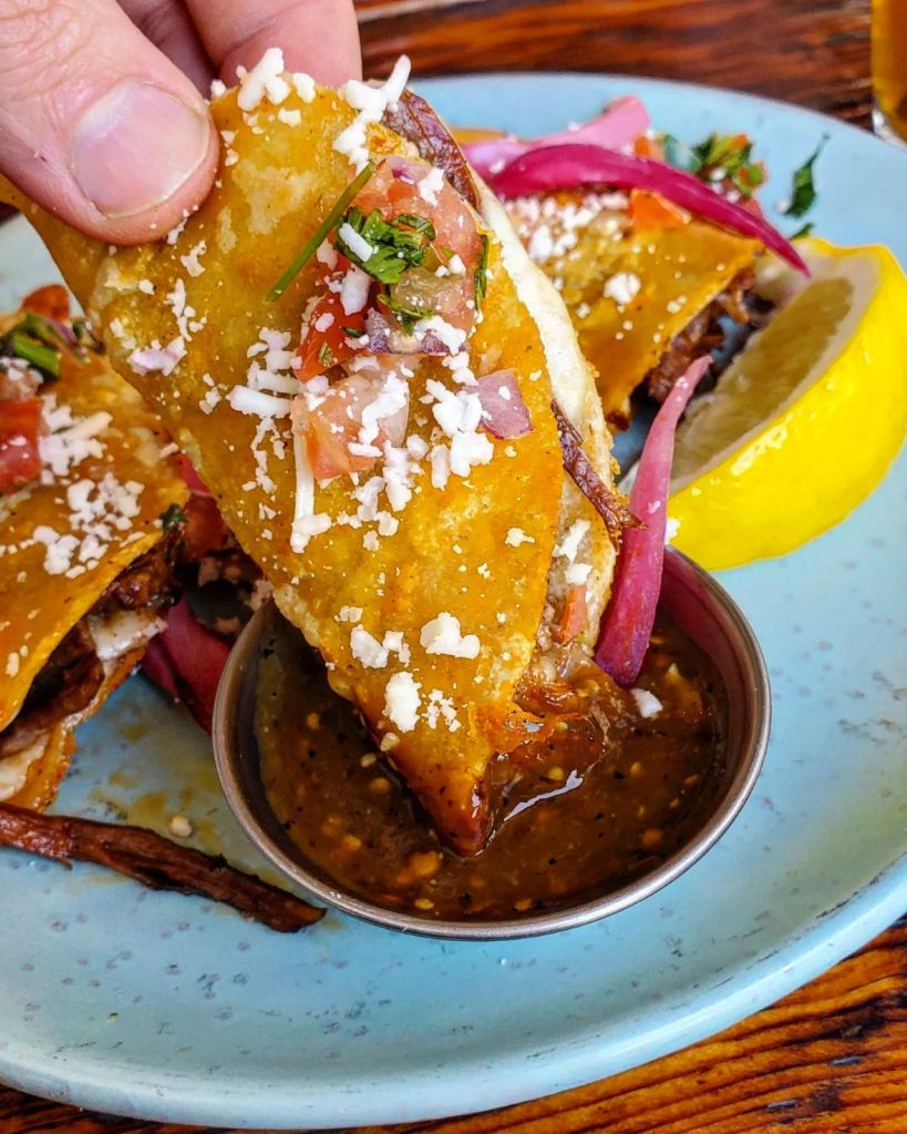 Since we were in the area we headed over to @1909temecula and tried out their Birria Taco Plate. Braised short rib in a stew of guajillo chile consume graced the 3 small corn tortillas coated in mozzarella cheese. These tacos were topped in cojita cheese, pico de gallo, pickled red onions and on the side was cup of roasted tomatillo salsa for triple dipping.