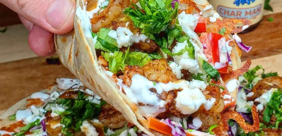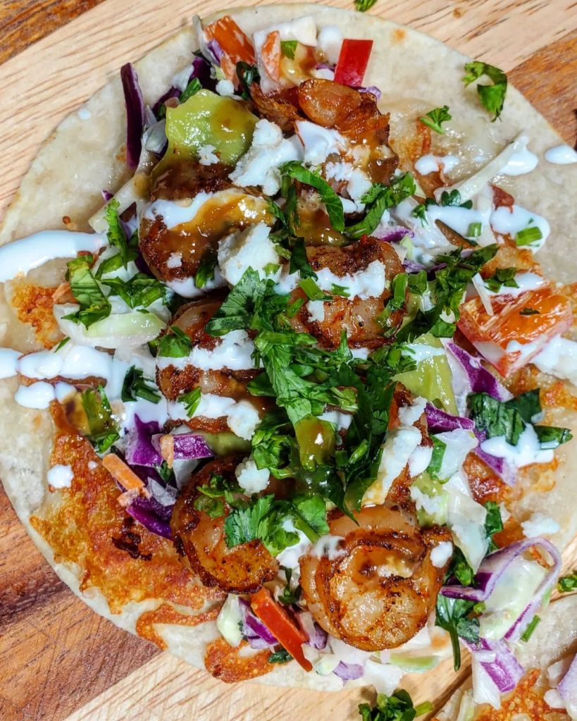 Flour tortillas with a crispy cheese layer and a pile slaw, guacamole, seasoned shrimp, crema, and a huge drizzling of @charmanbrand Caribbean hot sauce for maximum deliciousness.