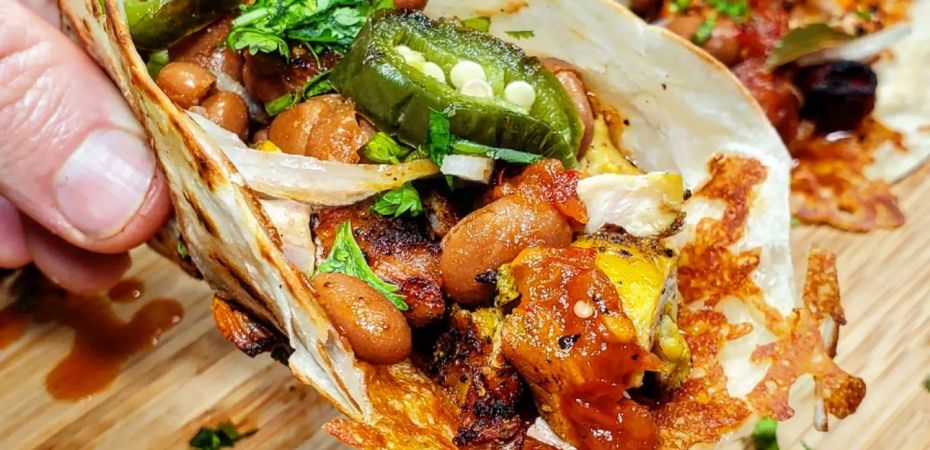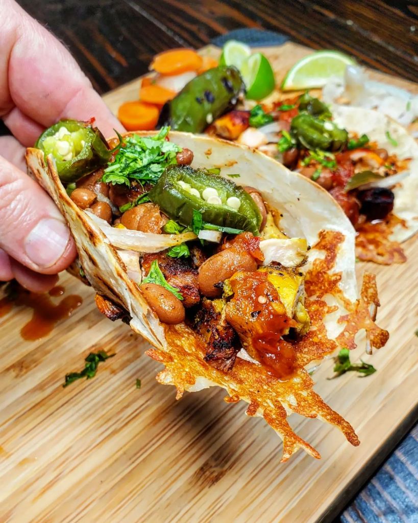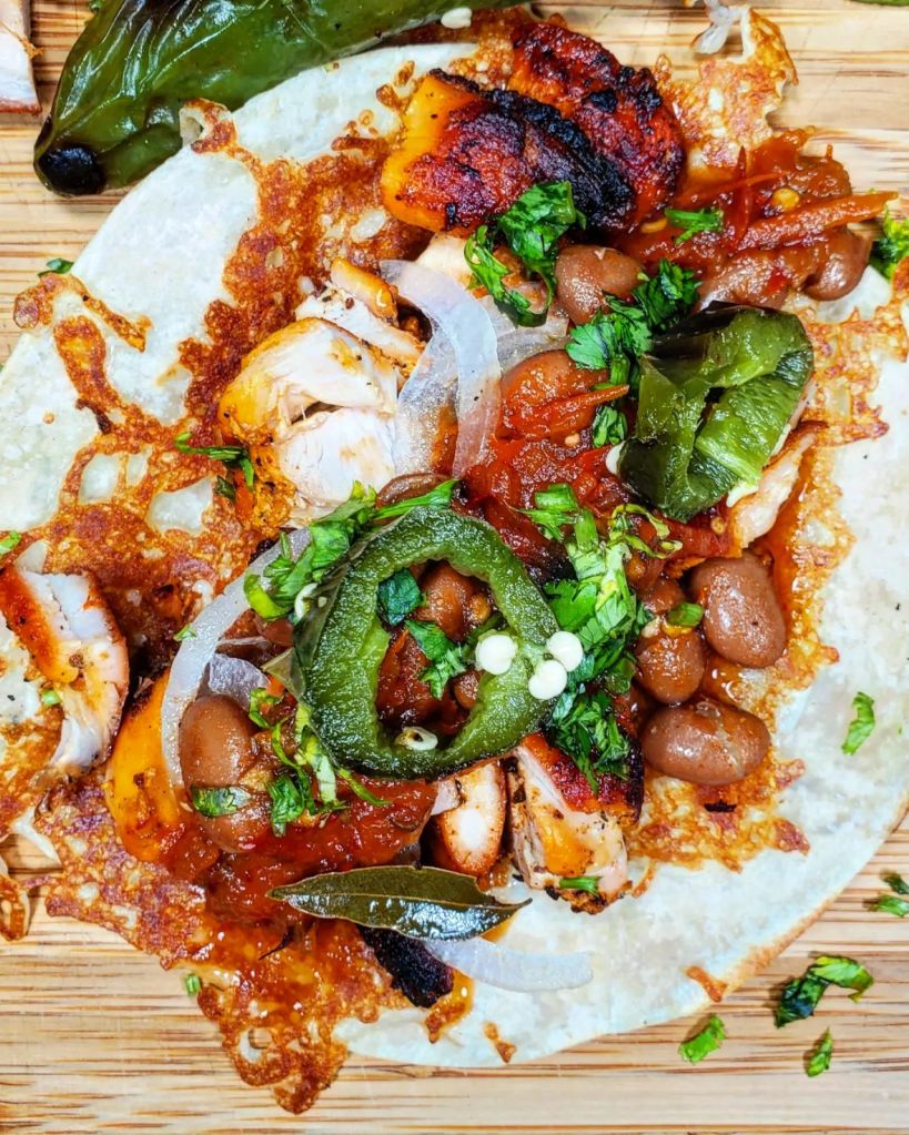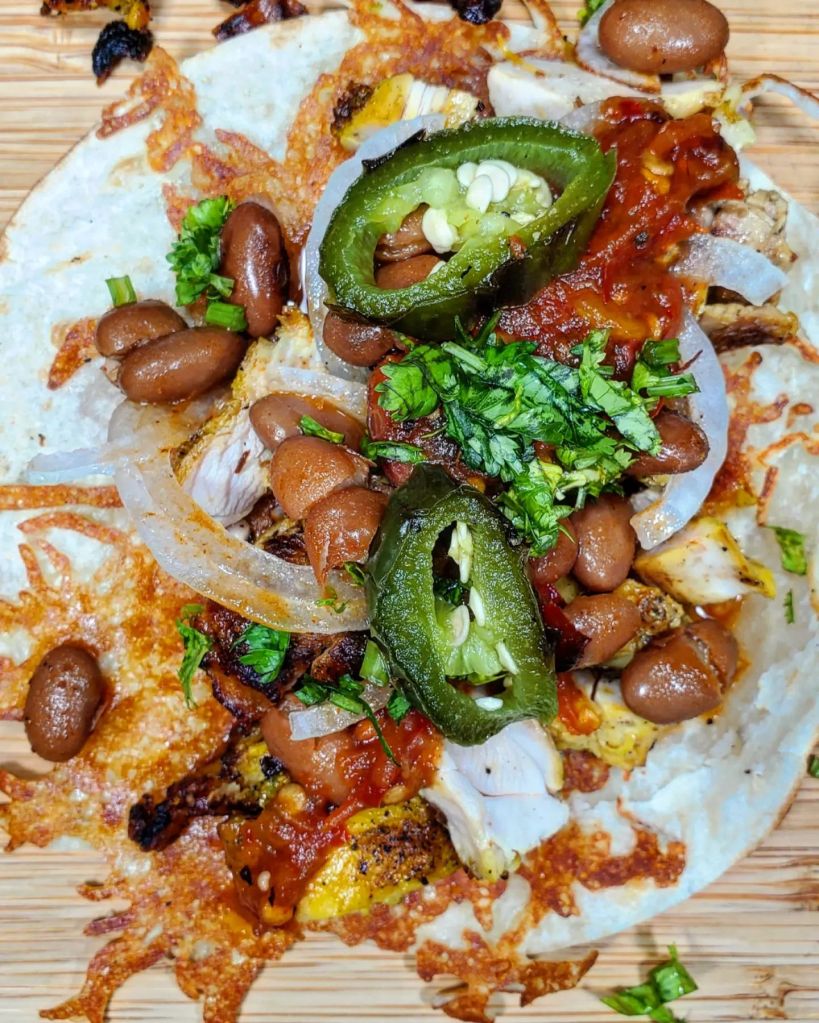 I used my favorite combination of flour tortillas with a cheesy crust as our vessel and dumped in the chicken followed by a scoop of beans, sliced white onions, cilantro, the salsa, and a few pieces of grilled jalapeno. ![]()
