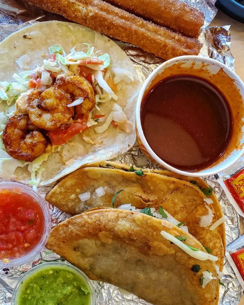 The birria was better than I expected and I dug the the crispy tacos they served it in. The Baja Shrimp tacos came in a soft corn tortilla with seasoned shrimp, a cream sauce and cabbage slaw and Those churros…….excellent.