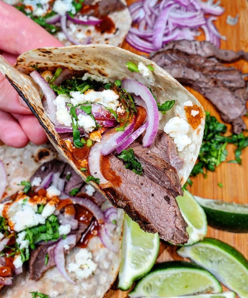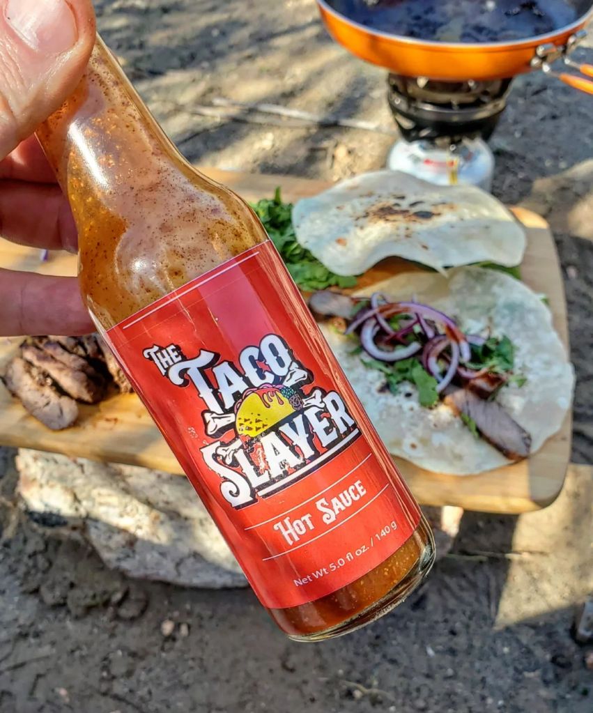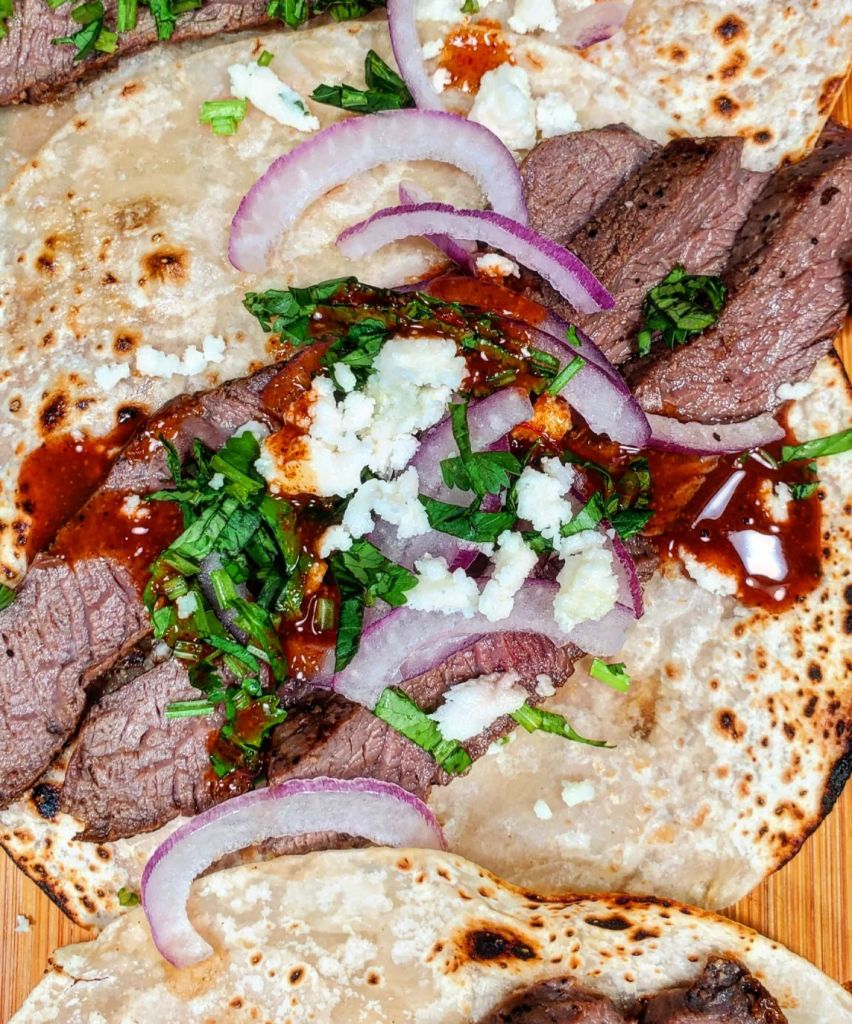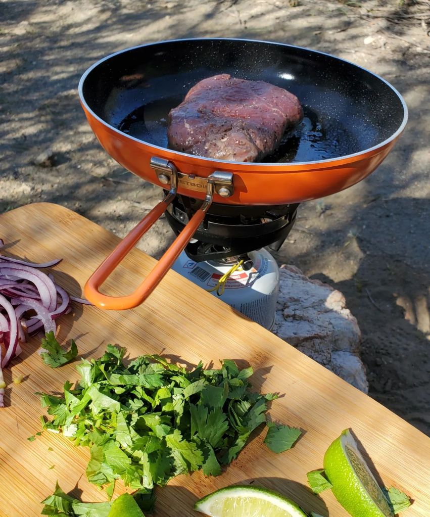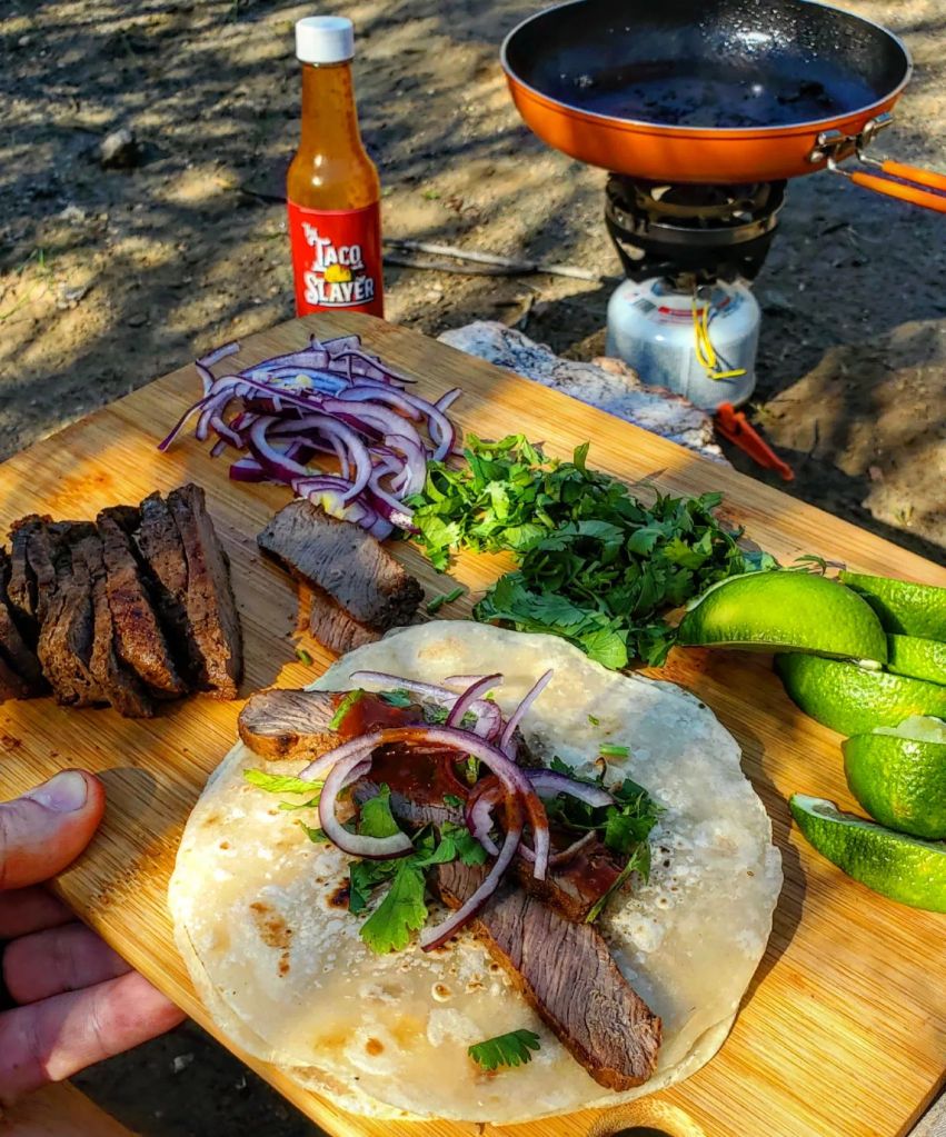I utilized the @adaptablemeals smokey bourbon sirloin steaks as they’re pre seasoned, individually sealed and easily ready to rock. While the meat cooked in a pan with a little oil, I chopped cilantro, and red onion. On high/med, it only took about 3min on each side and while the meat rested, I heated up a few flour tortillas over the open fire for a few seconds.