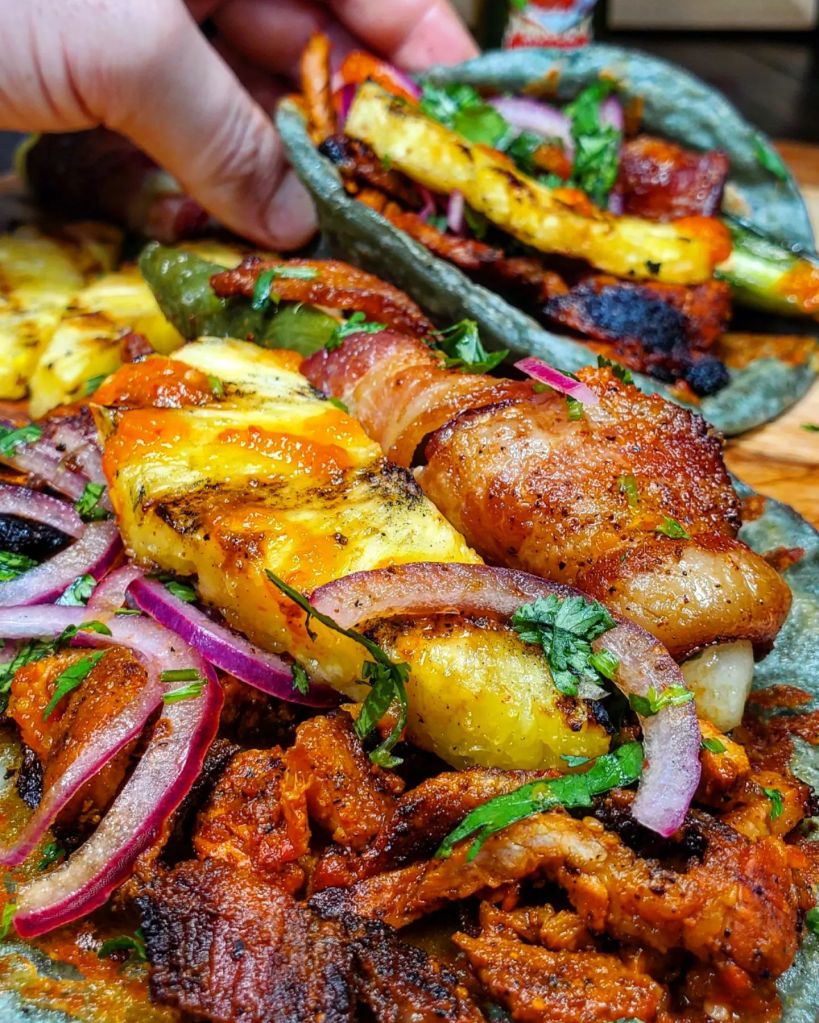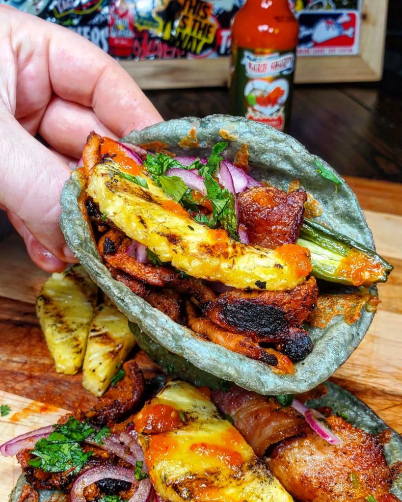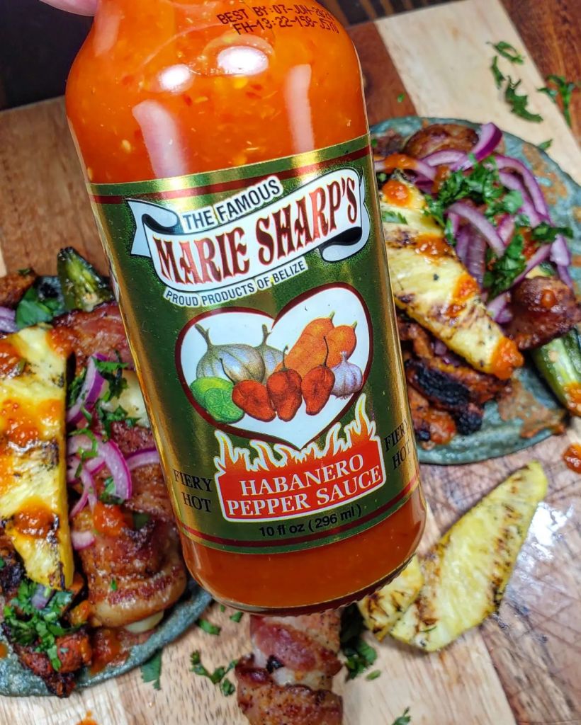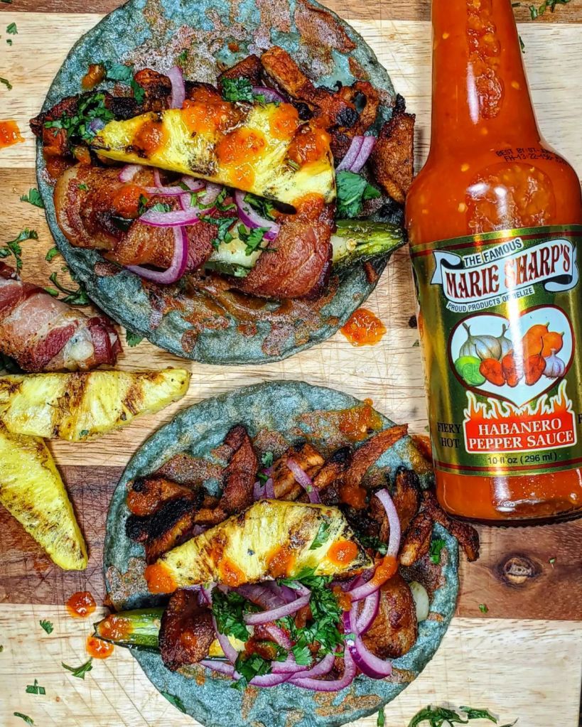 I placed a mountain of grilled adobada into the tortilla with a huge bacon wrapped queso stuffed jalapeno, a little red onion ( soaked in lime juice), cilantro, and a chunk of grilled pineapple. To finish these tacos off I drizzled in the incredible combination of red Belizean habaneros, onion, garlic, and carrots that is the @mariesharpsusa FIERY HOT habanero sauce.