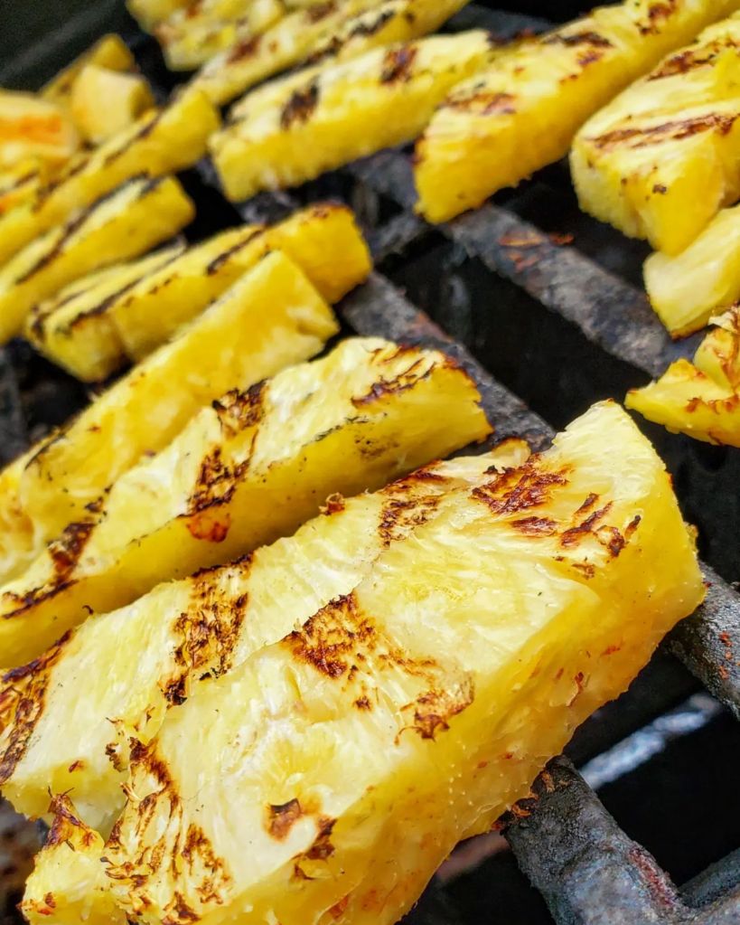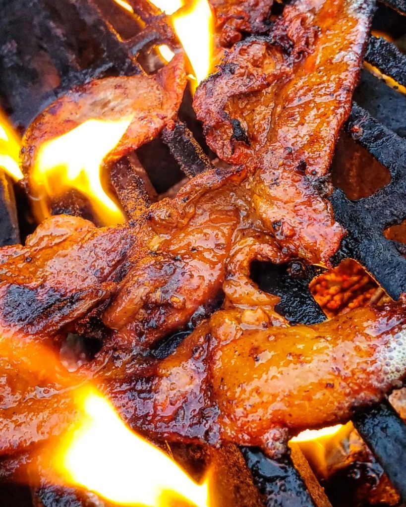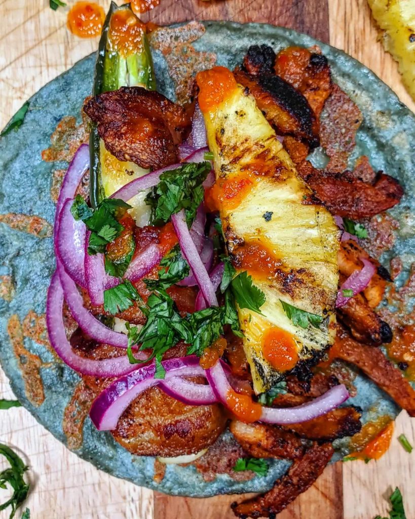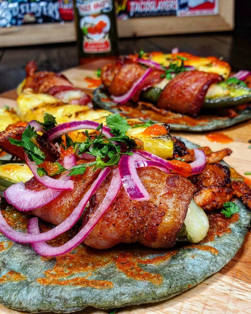 I placed a mountain of grilled adobada into the tortilla with a huge bacon wrapped queso stuffed jalapeno, a little red onion ( soaked in lime juice), cilantro, and a chunk of grilled pineapple. To finish these tacos off I drizzled in the incredible combination of red Belizean habaneros, onion, garlic, and carrots that is the @mariesharpsusa FIERY HOT habanero sauce.