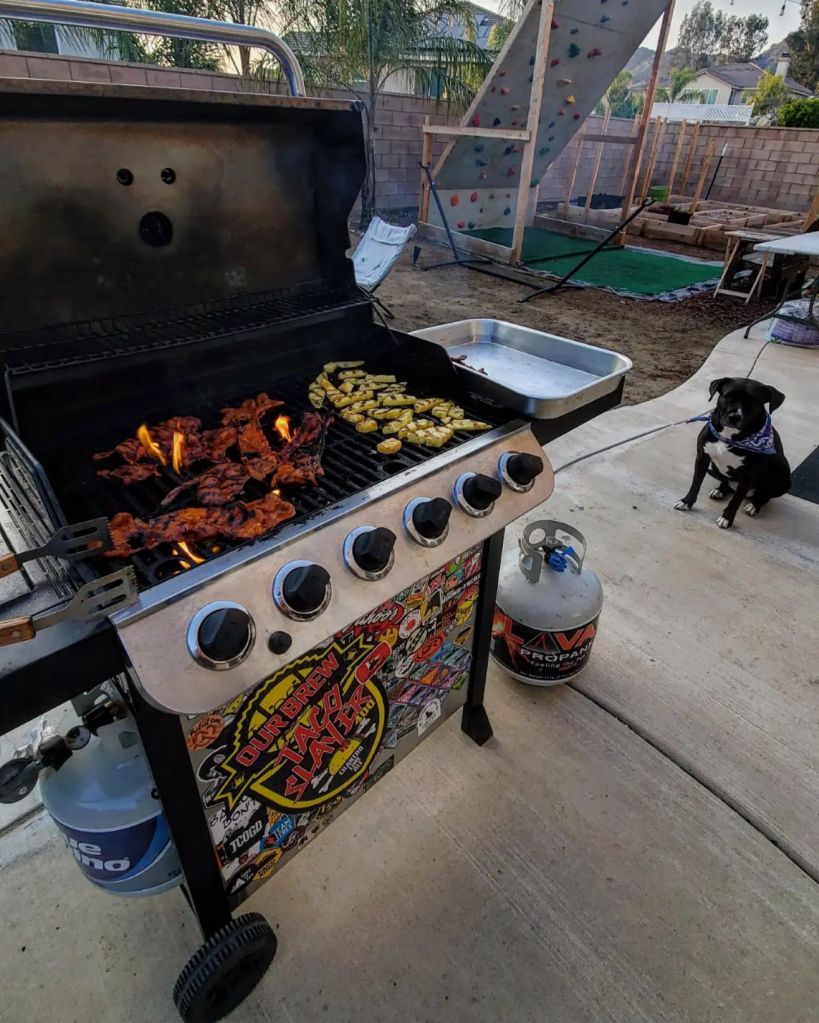 Outside, I fired up the @charbroilgrills and flame cooked the adobada and pineapple up to their proper temperatures while inside I chopped up my red onion, cilantro, and layered my blue tortillas with a little cheese.