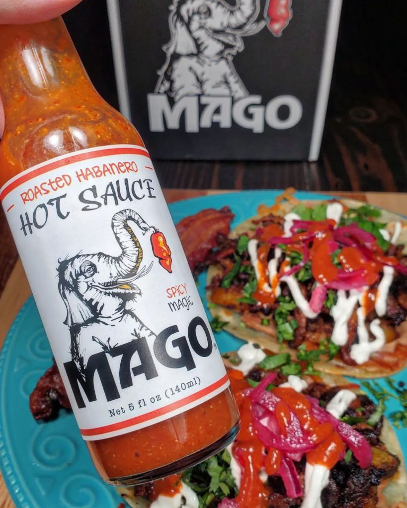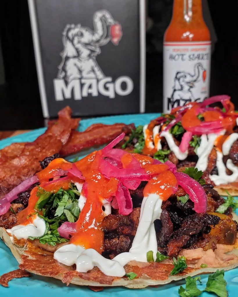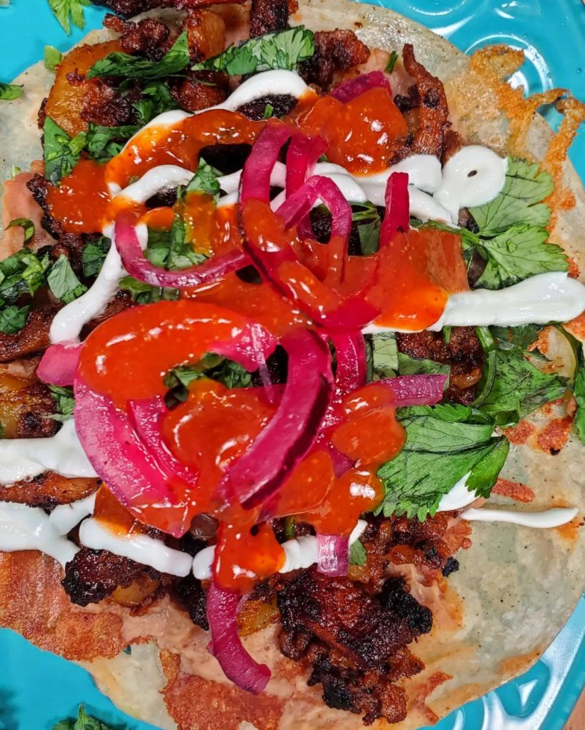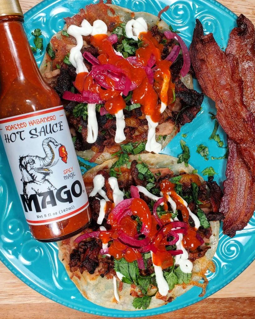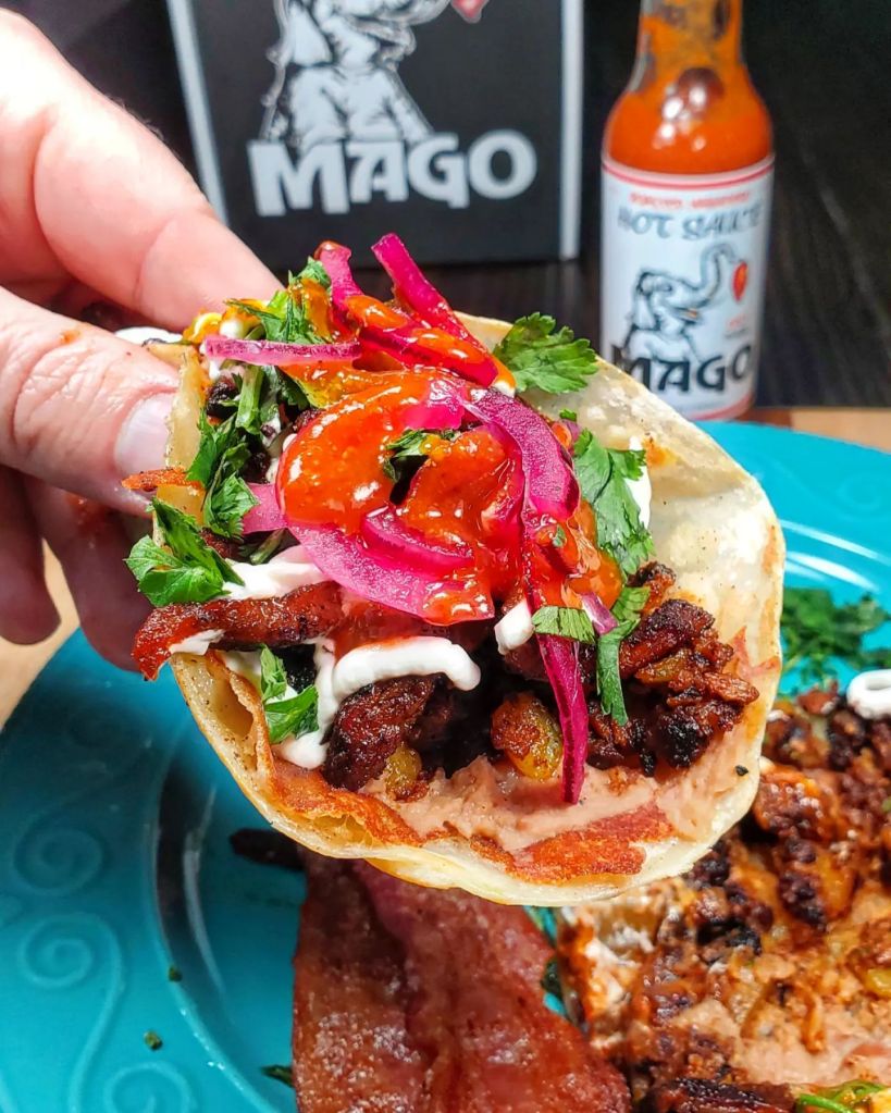 I fried the adobada up in bacon grease and afterwards piled it and the chorizo/potato/onion concoction into a hot flour tortilla housing a crispy piece of cheese and a layer of refried beans. We drizzled on a little crema, cilantro,pickled onions and a whole bunch of one of my favorite habanero sauces of all time, Roasted Habanero from @magohotsauce .