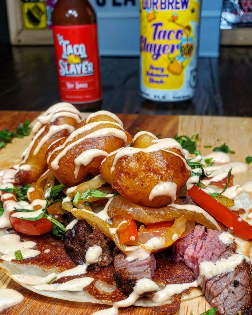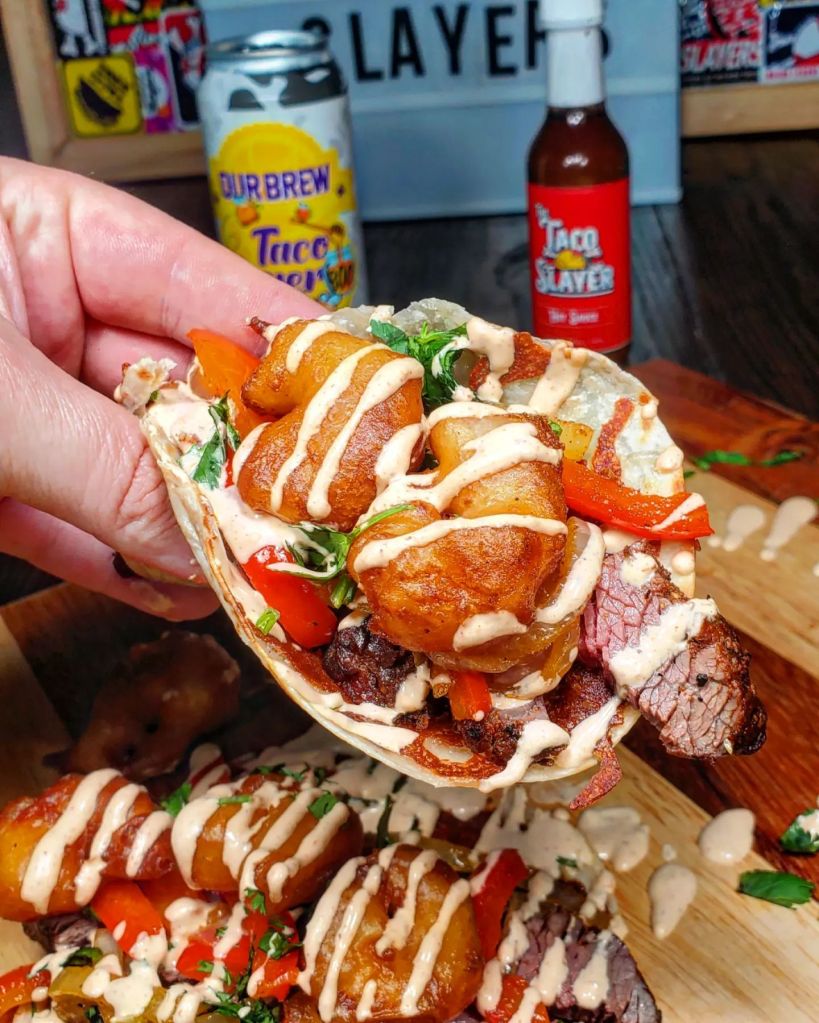 From taco Days 400 to 800 we worked with my friends over at the @ourbrew brewery in Redlands, CA to make some pretty tasty TacoSlayer special edition beers. It was a really cool experience as we went from brewing and making tacos in their garage to brewing and making tacos in their huge brewery. Now days they’ve really settled in to their building, operating their big time brewing machines and fully decorated by the talented @whin_iii .