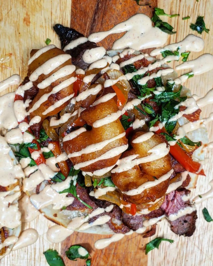 Back inside we chopped and seasoned some red bell peppers and onions for stir frying in left over bacon grease. Next I mixed together a spicy cream sauce using some @shakasauce