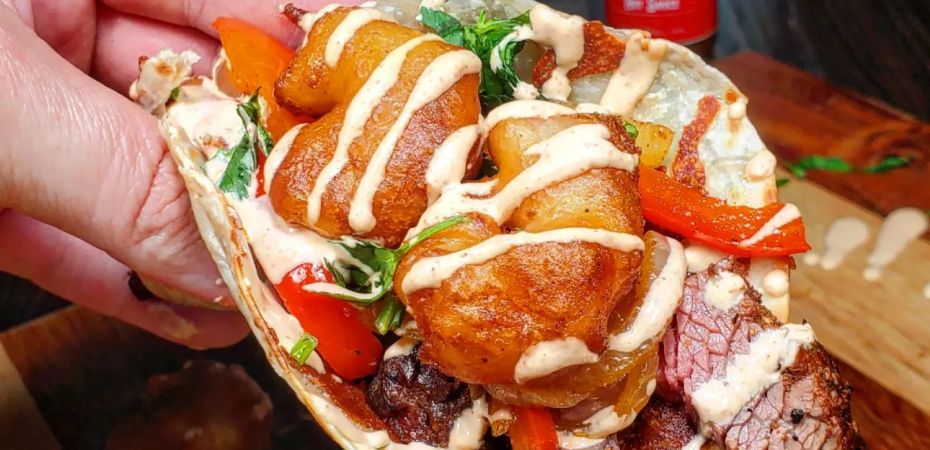 These tacos were constructed together on a toasted flour tortilla with melted and crusted mozzarella cheese. I placed in a layer of chopped tritip and dropped in the stir fried bell peppers and onions followed by a sprinkling of cilantro, a handful of beer-battered skrimps and drizzling of spicy cream sauce.