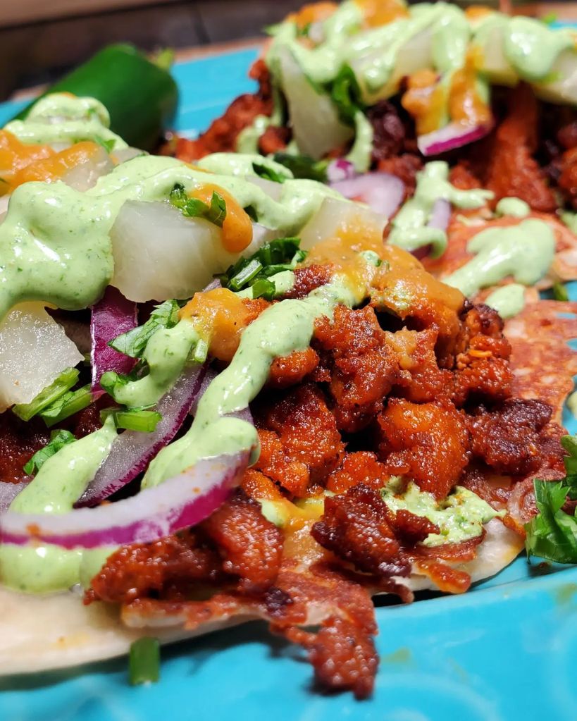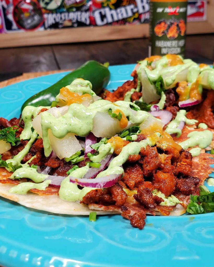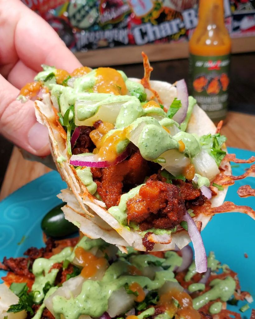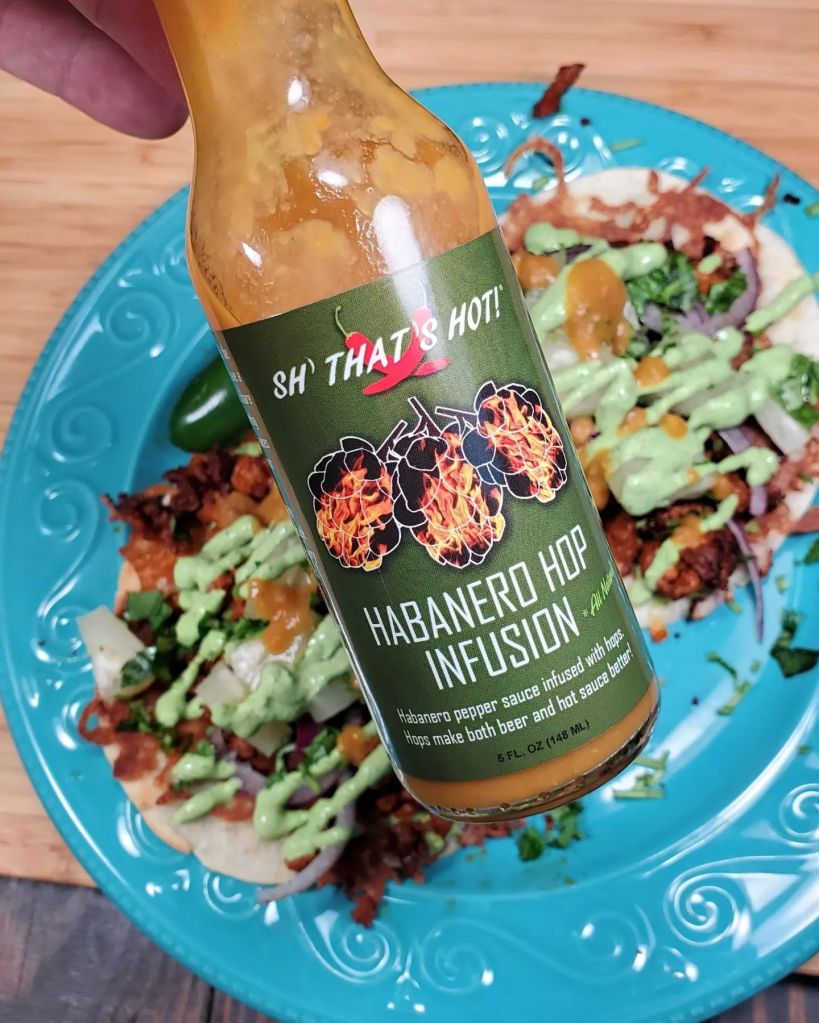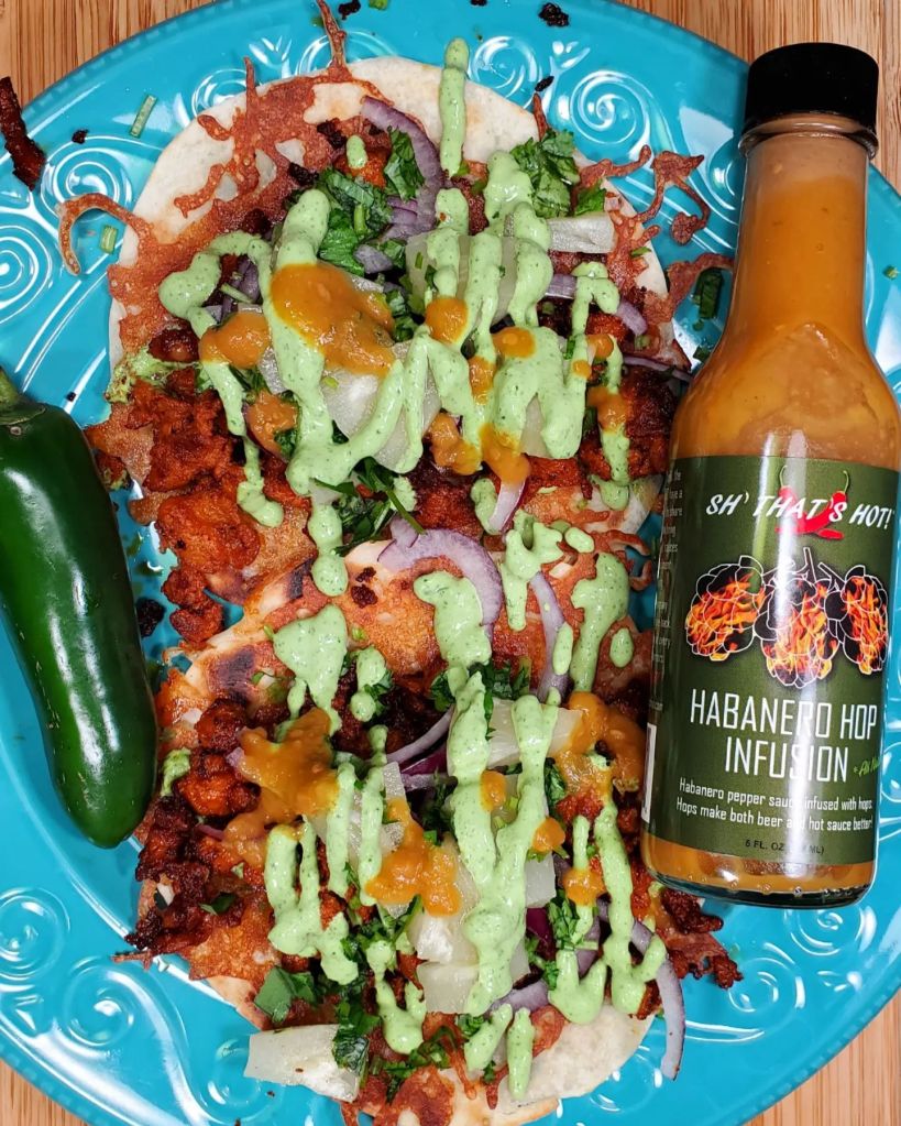 First a mountain of meat, cilantro, red onion, and pineapple, then a drizzle of homemade jalapeno cream before several drops of the tasty @shthatshot Habanero Hop Infusion hot sauce . I LOVE HABANERO sauces and this one definitely shines.