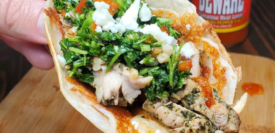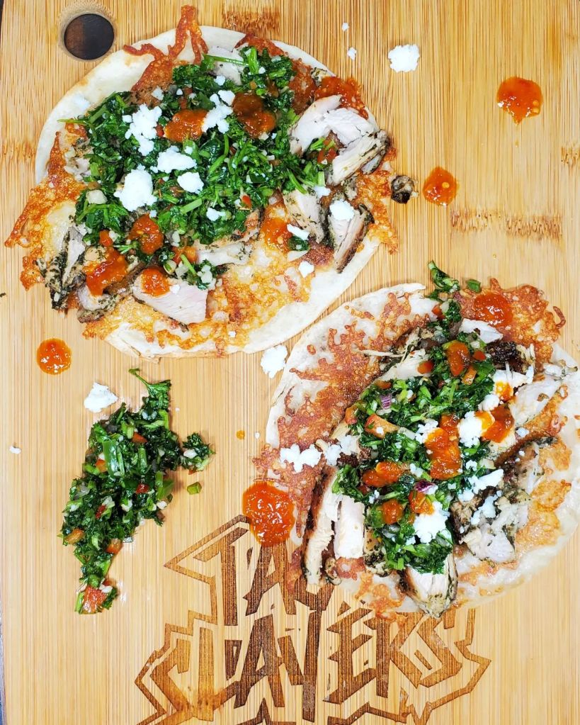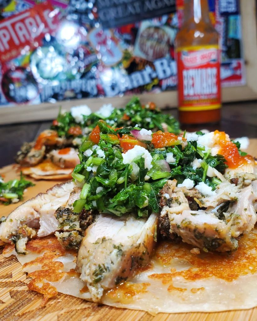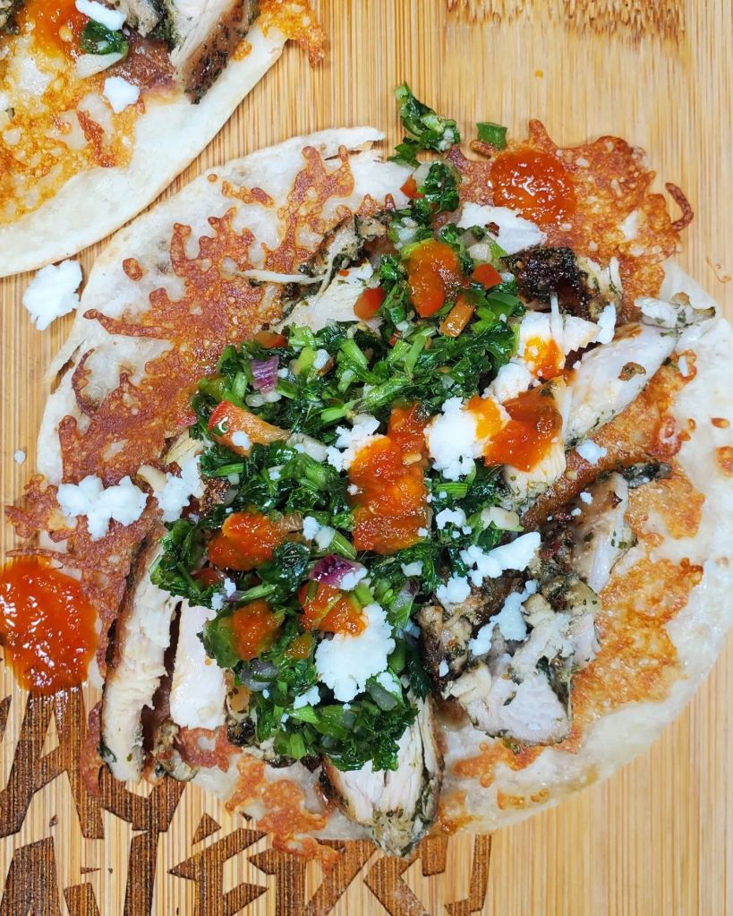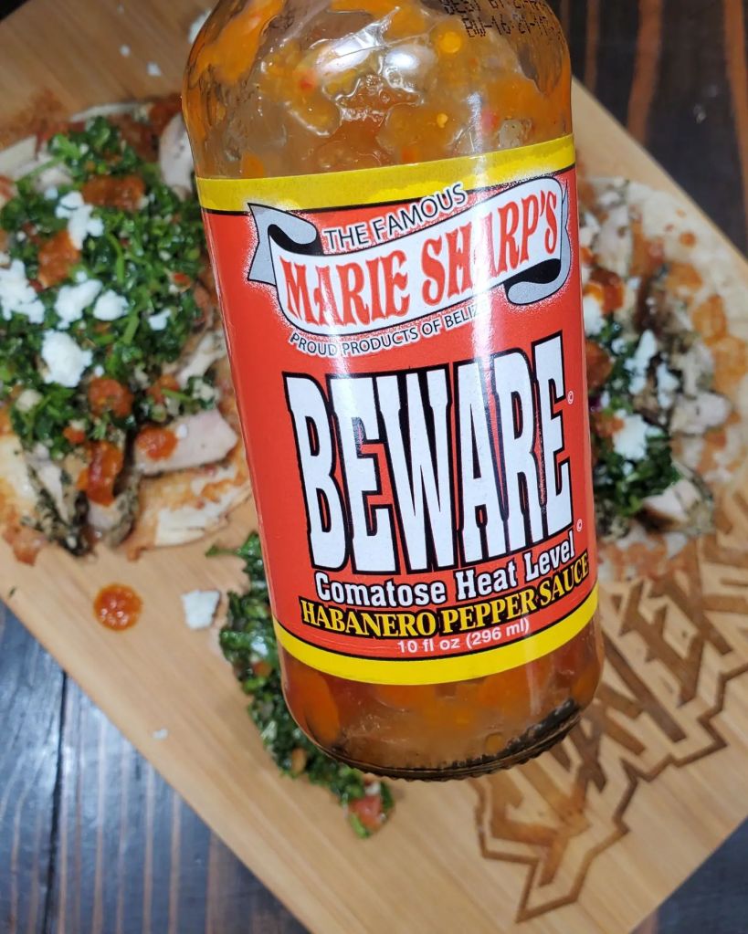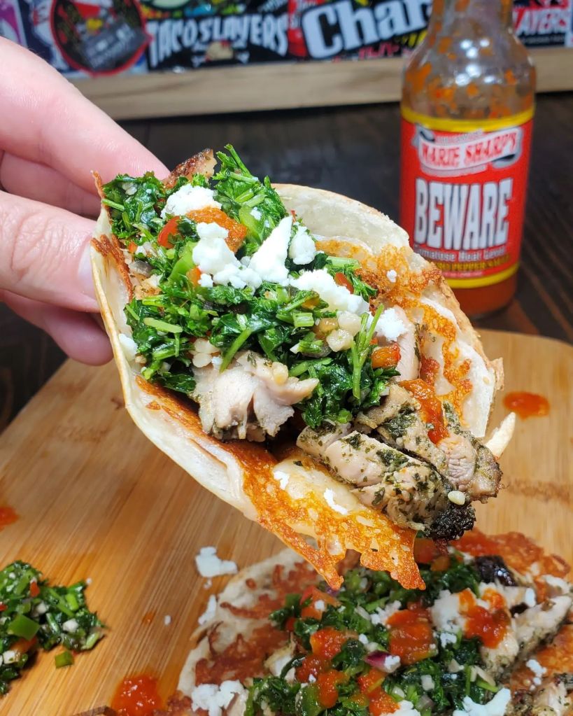 After the meat was cooked up I piled it all into my favorite, a mozzarella crusted flour tortilla. First the chicken, then a very generous helping of fresh chimichurri , a little queso fresco and a huge drizzling of @mariesharpsusa BEWARE Habanero Sauce. Perhaps the perfection addition to any chimichurri.