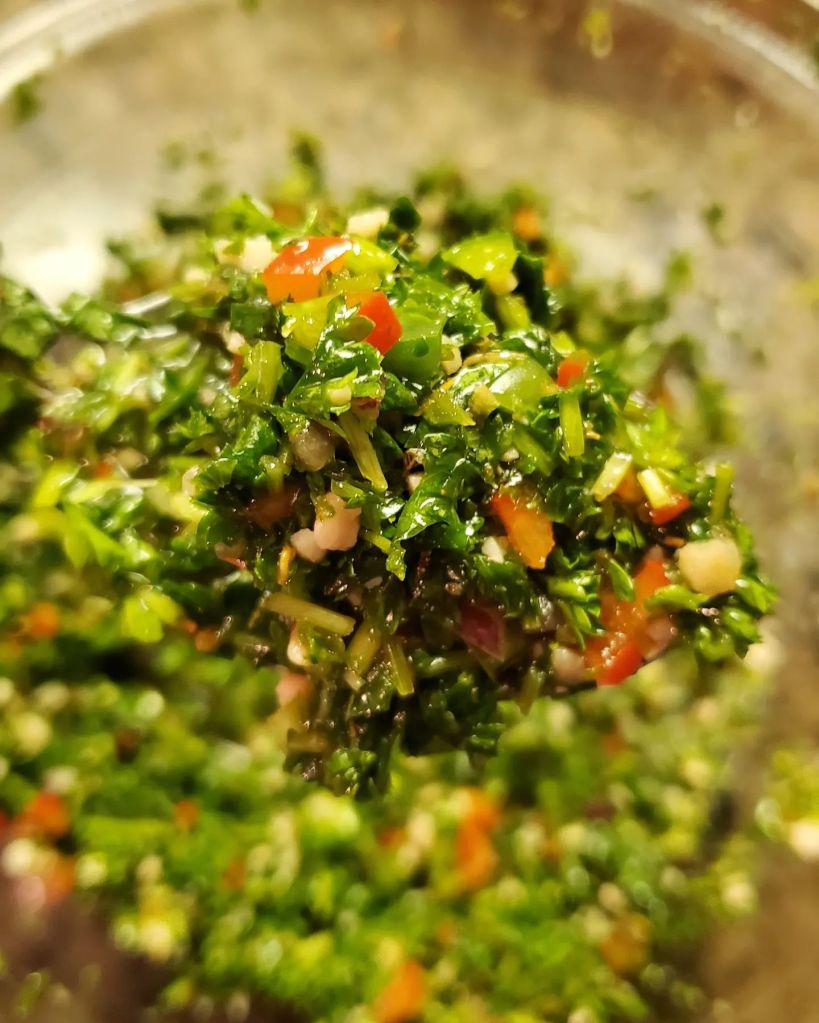 I didn’t go too crazy this time, instead I opted to pair these tacos with a super tasty homemade chimichurri sauce of my own. I chopped and mixed together cilantro, parsley, oregano, red pepper, jalapeno, garlic, red onion, red vinegar, oil and little salt.