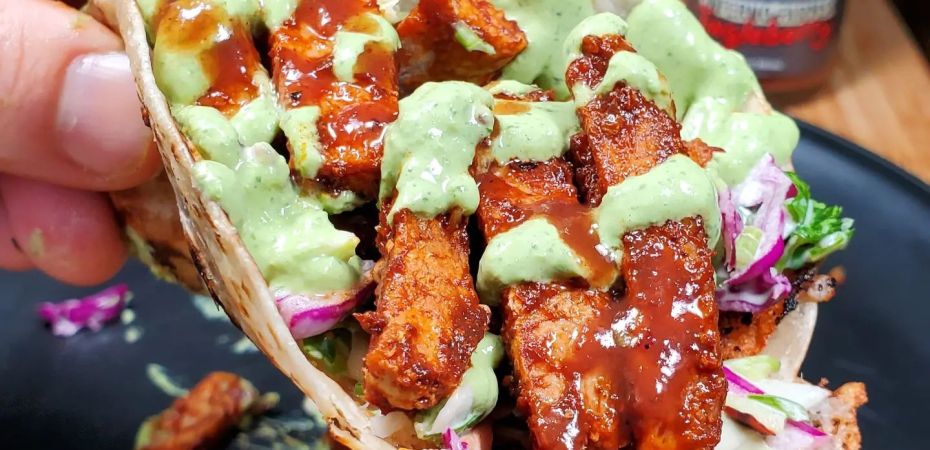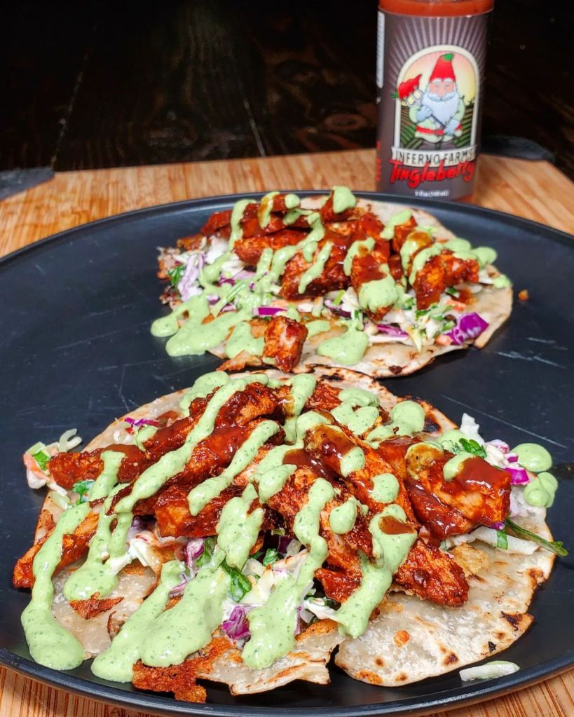 I coated the surface of these tacos with a homemade cilantro cream and drizzling of @infernofarms sweeeet Tingleberry hot sauce.