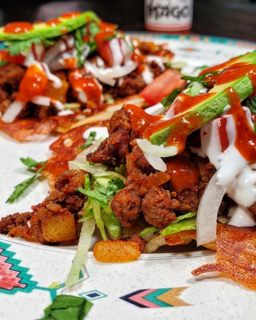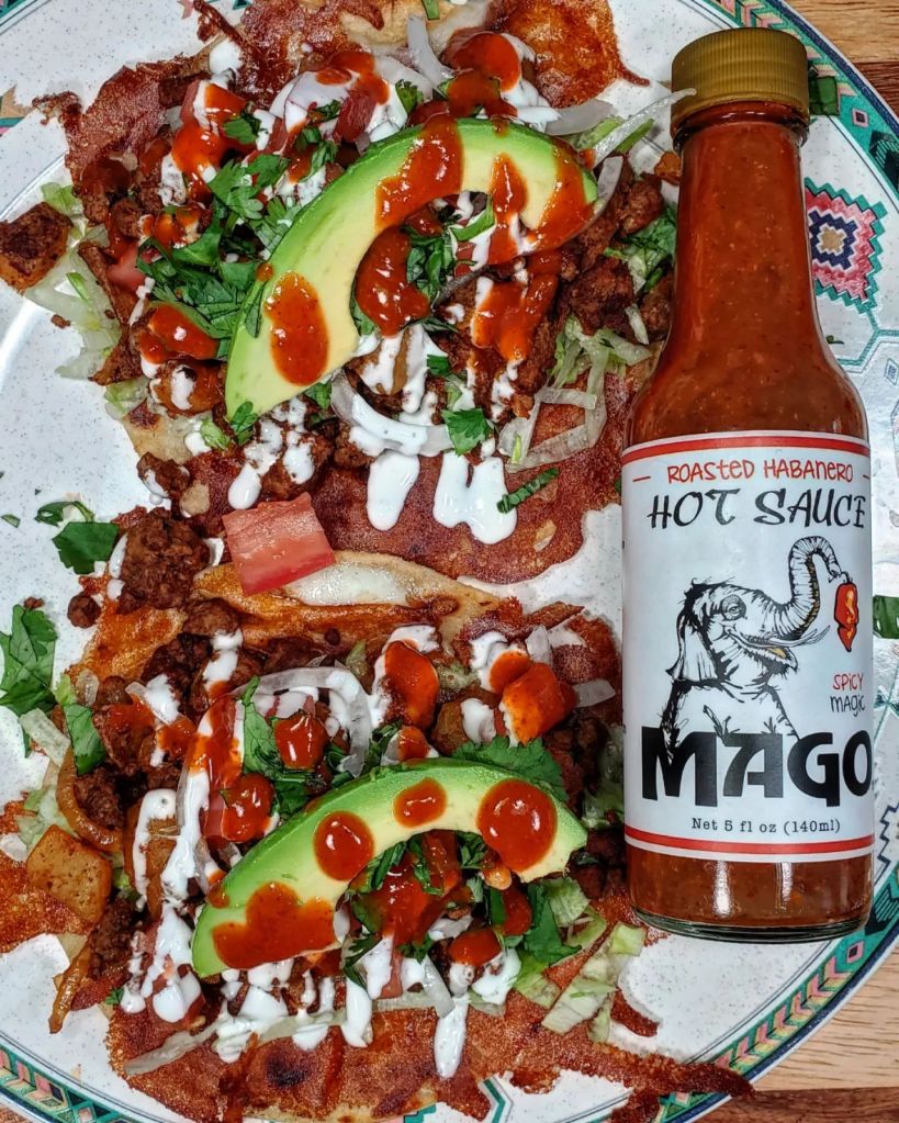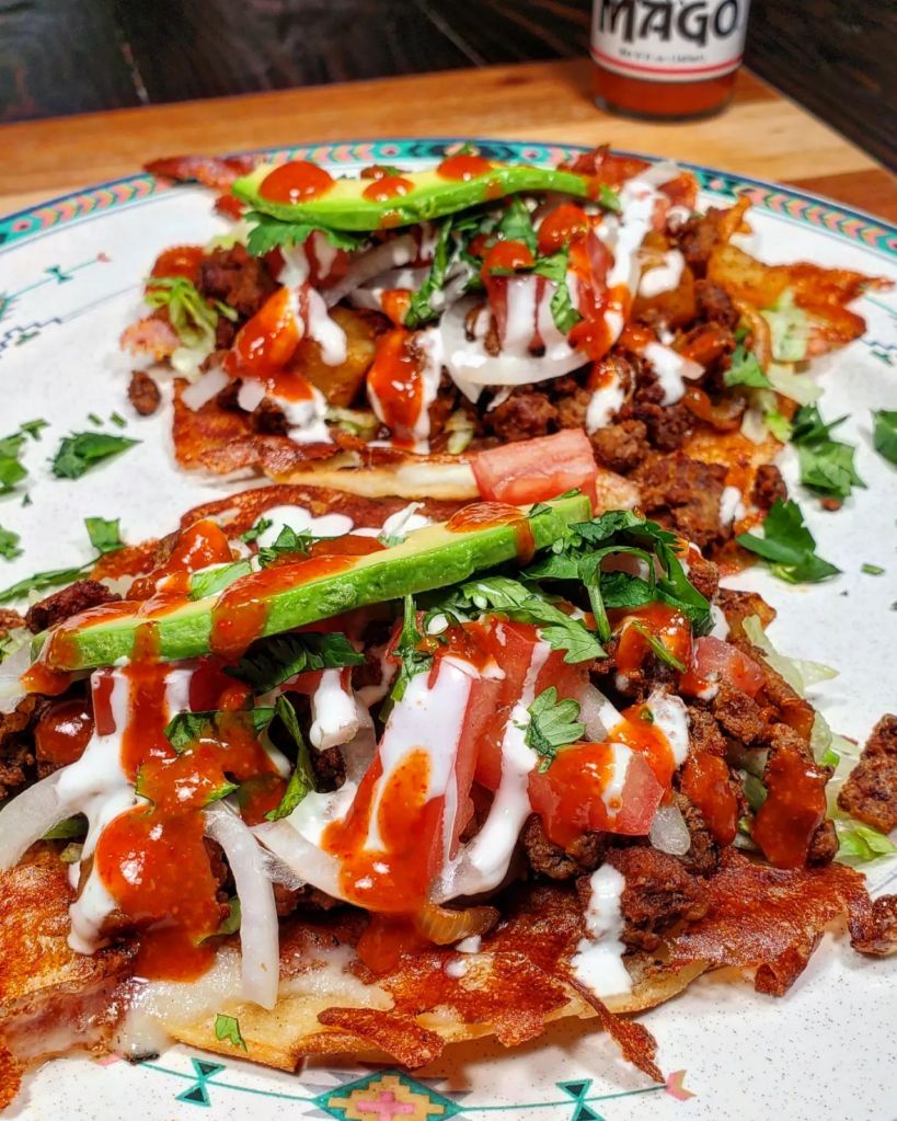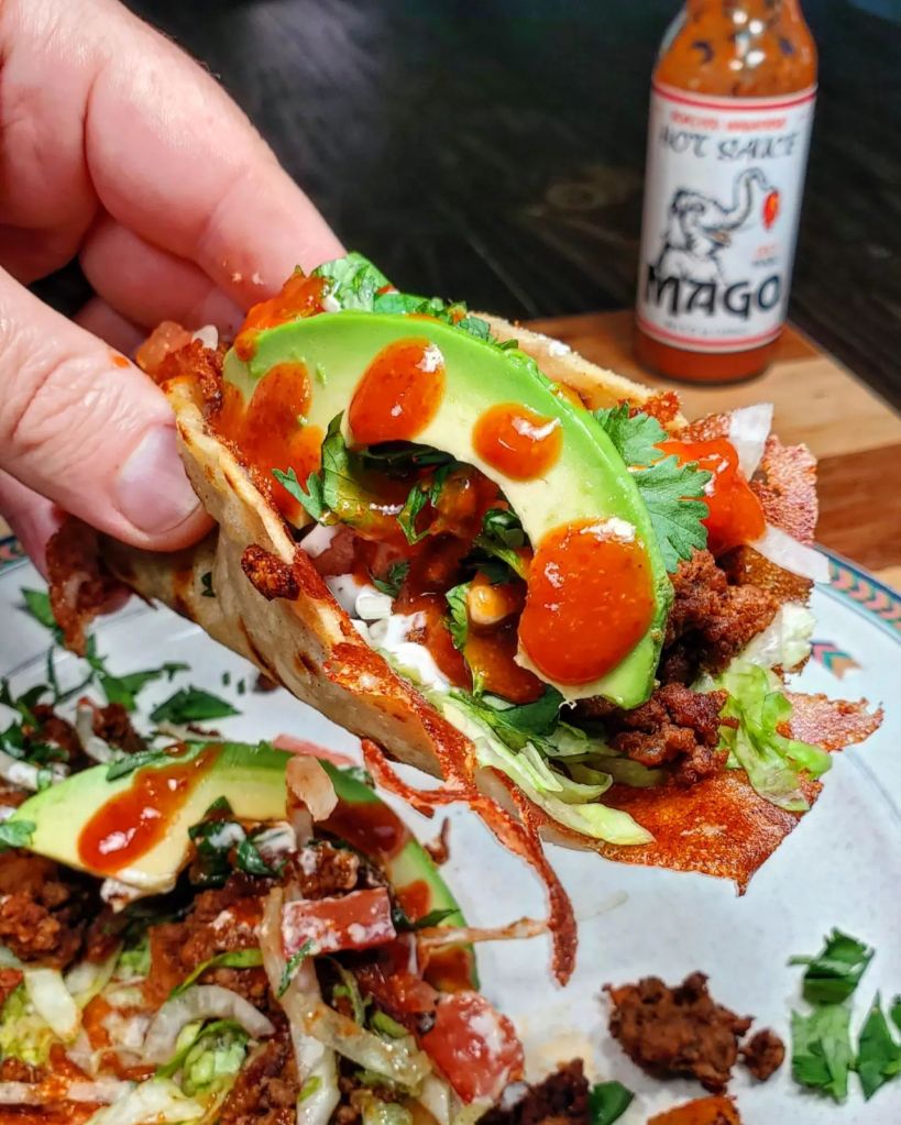 Afterwards I piled that delicious concoction into an oil fried @elcomalproducts corn tortilla with melted cheese. I added in lettuce, tomato, onion, cilantro avocado and a few drops from @magohotsauce