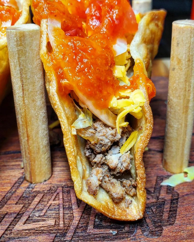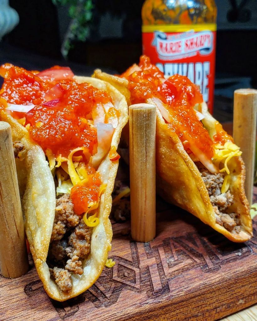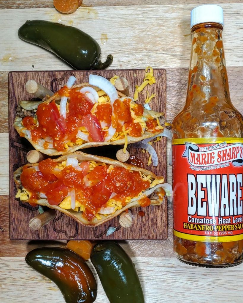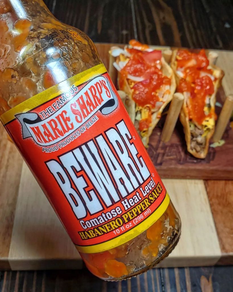 Quick, easy and some of my absolute favorite tacos are the ground beef tacos but today, I flooded them with BEWARE Habanero hot sauce from @mariesharpsusa !