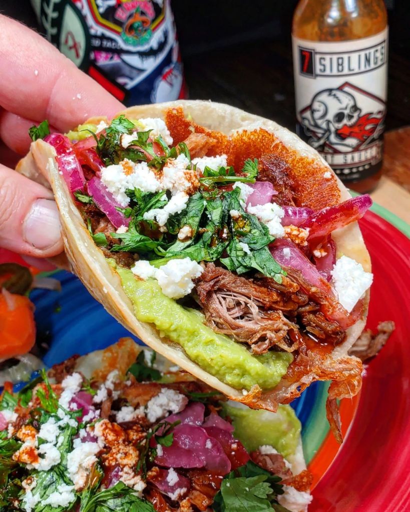 Slow cooked pork with guacamole, pickled red onions ,cilantro, and queso fresco on a cheesed up flour tortilla and drizzled with @7siblingshotsauce