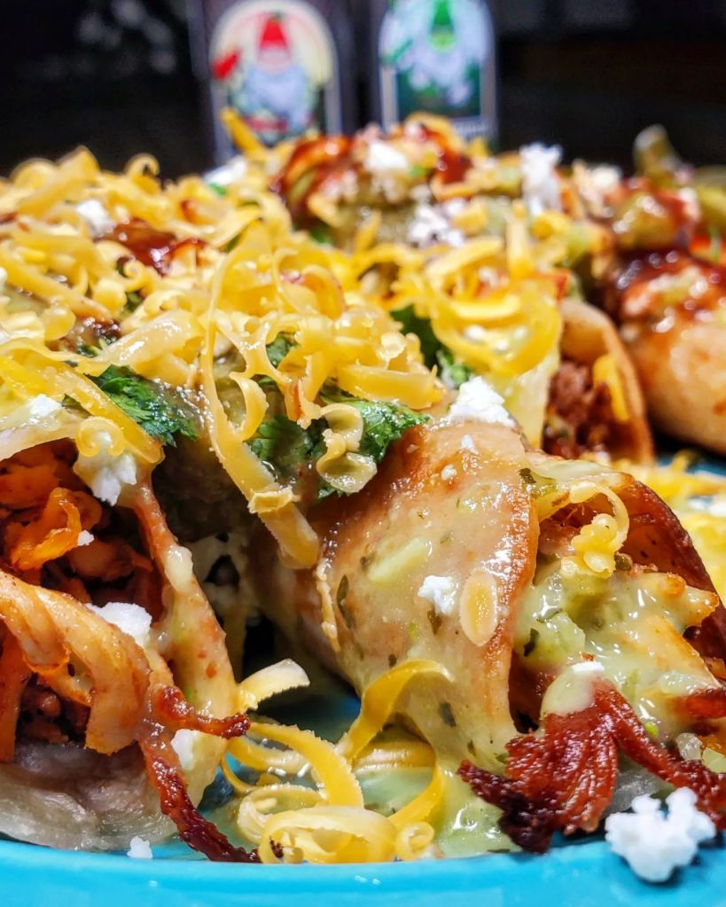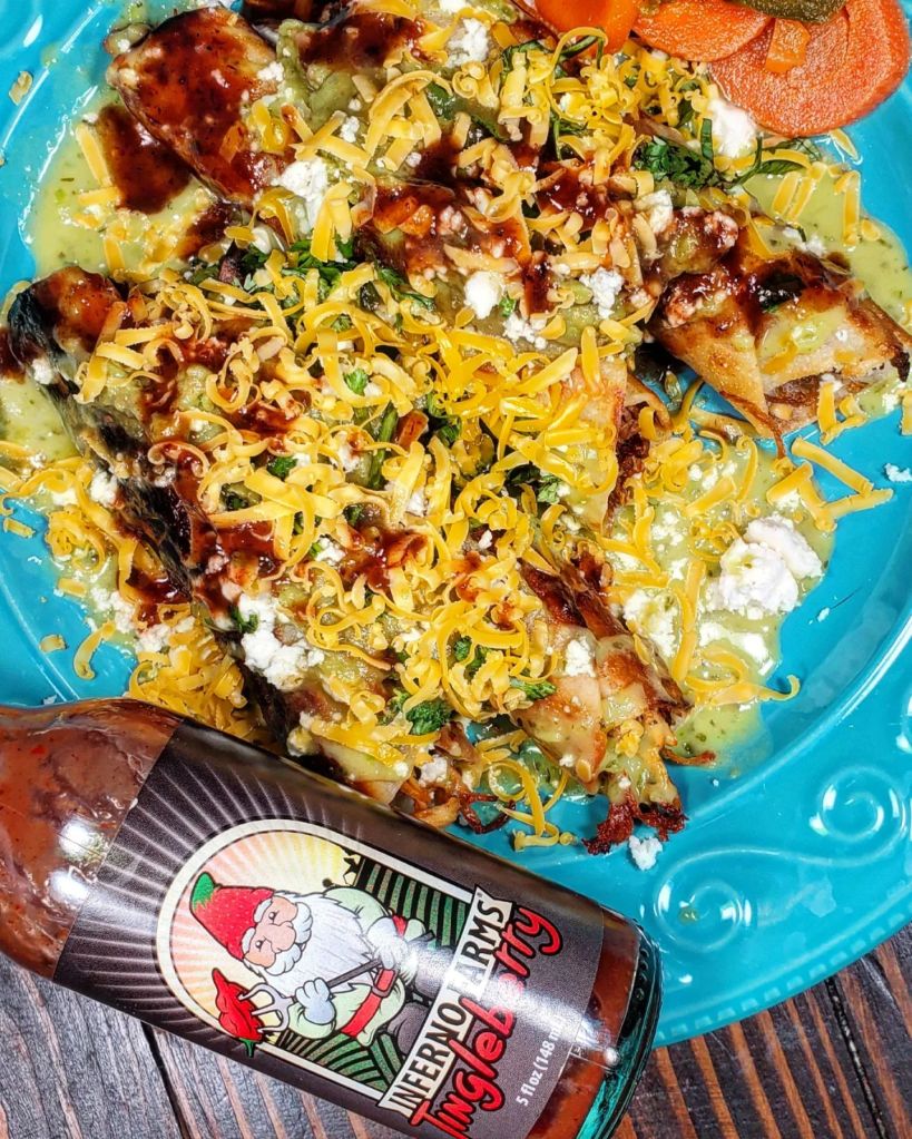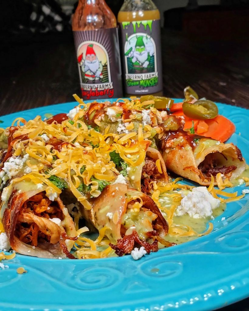 After the rolled tacos were crispy I doused them in guacamole sauce and sprinkled on both cheese, cilantro and a variety of @infernofarms tingle berry and green monster hot sauces. ![]()