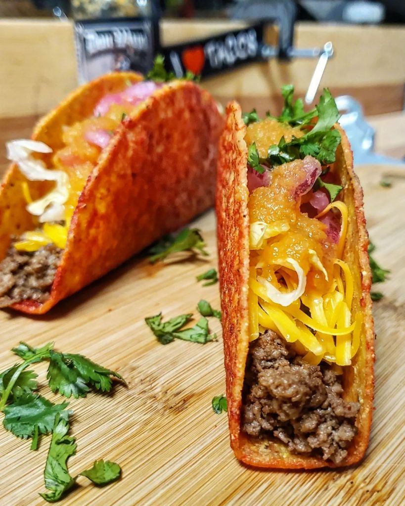 it’s been a bit busy at the print shop and didn’t have a ton of time to go “full ham” on tacos last night. Instead I pulled out some ground wagyu and after cooking it up I tossed it into some @takisusa hard shells. Then I piled in the condiments: cheese, lettuce, pickled red onions, and a whole bunch of @donwapohotsauce @rickthorne hot sauce.