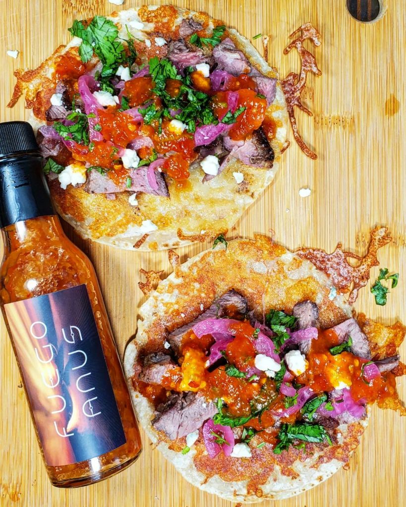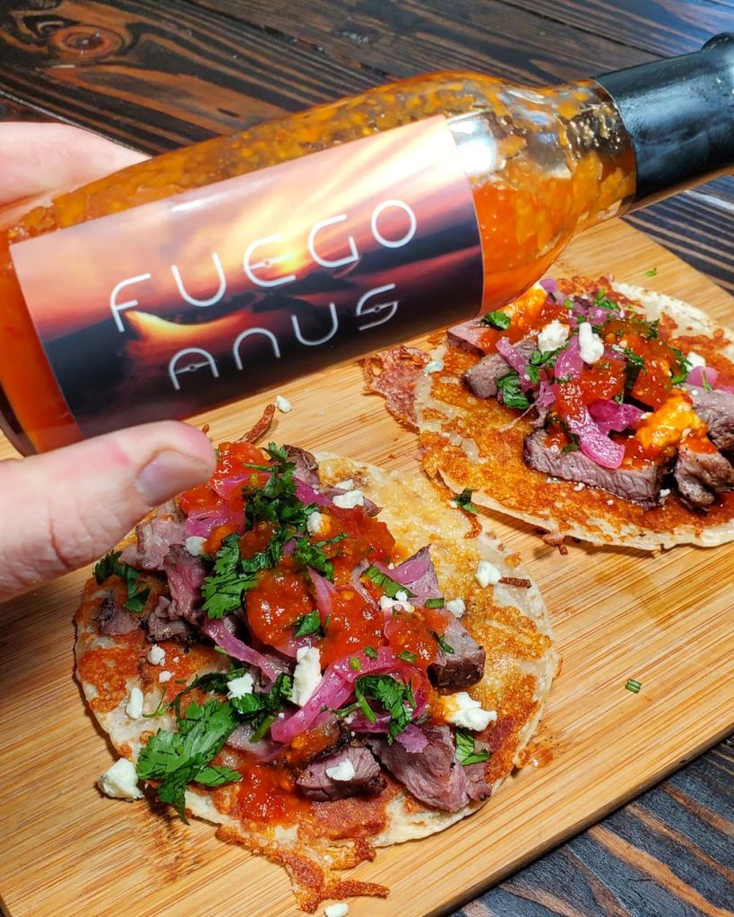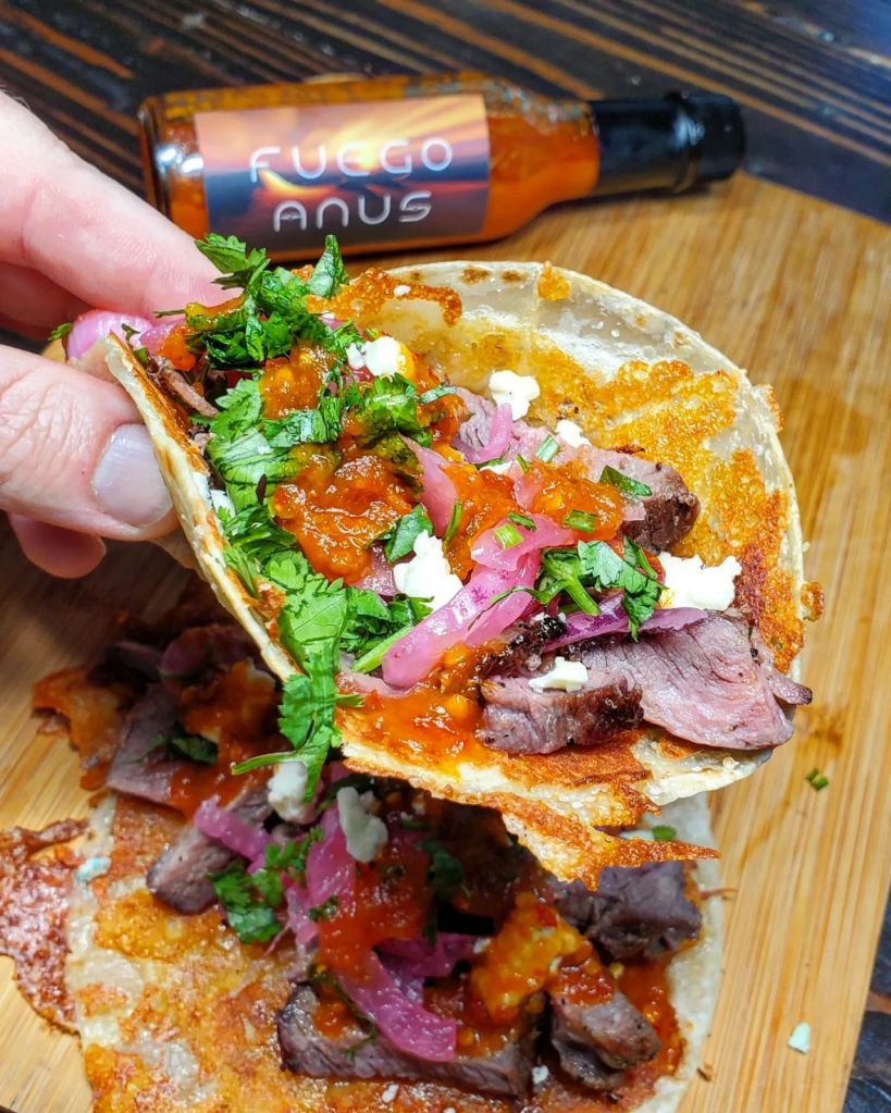 Some bacon wrapped filets sliced and placed inside a flour tortilla with cilantro, pickled red onions, queso and @dr.duckbutter Fuego anus hot sauce…
