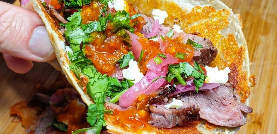 Some bacon wrapped filets sliced and placed inside a flour tortilla with cilantro, pickled red onions, queso and @dr.duckbutter Fuego anus hot sauce…