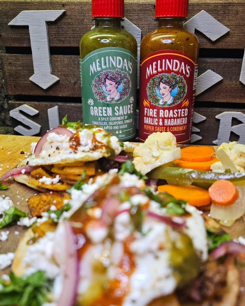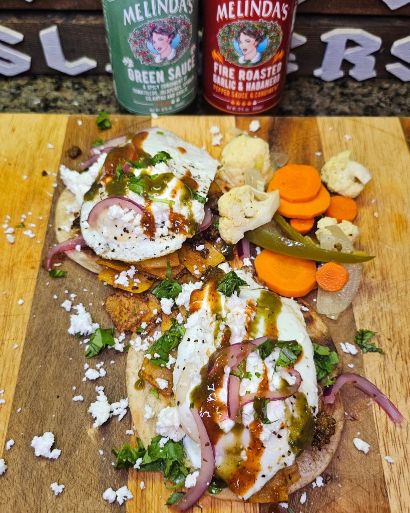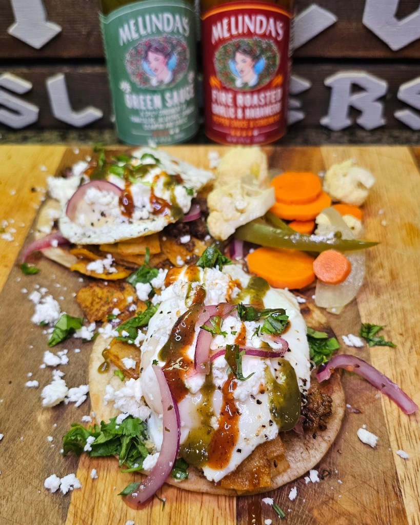 In a flour tortilla I placed a layer of fried and diced @elcomalproducts corn tortillas that I had cooked with a combo of homemade Verde & Rojas sauces. Then I added in cilantro, pickled onion, chorizo, an over easy egg, a drizzling of @tiofranciscocheese Mexican crema, queso cotija, queso fresco, more cilantro, more onions, and the some @melindasfoods Green Sauce and Fire Habanero.