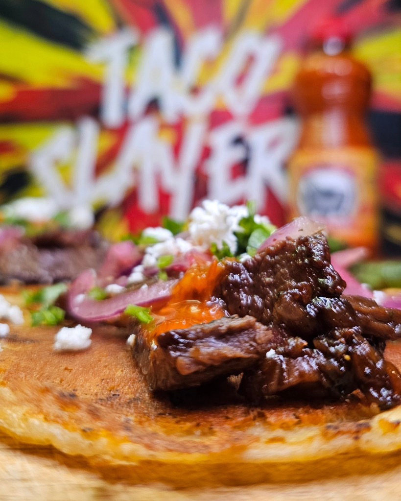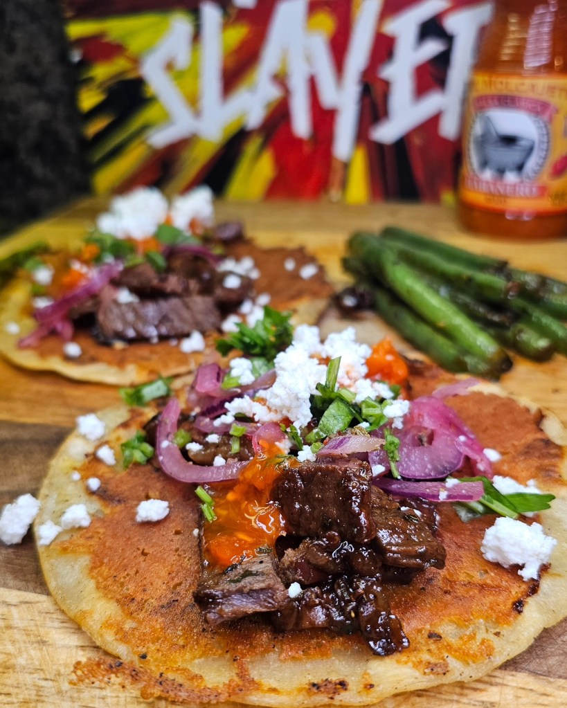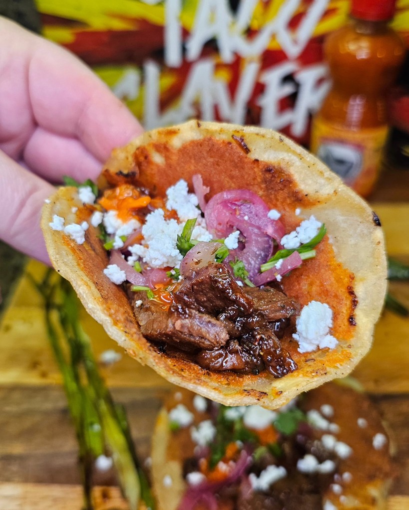 Once the meat was cooked up i piled it into some cheese crusted corn tortillas with the usual suspects: pickled red onion, cilantro, @tiofranciscocheese queso fresco and lastly drizzled in some @delmolcajetesalsas extra hot habanero for maximum heat.