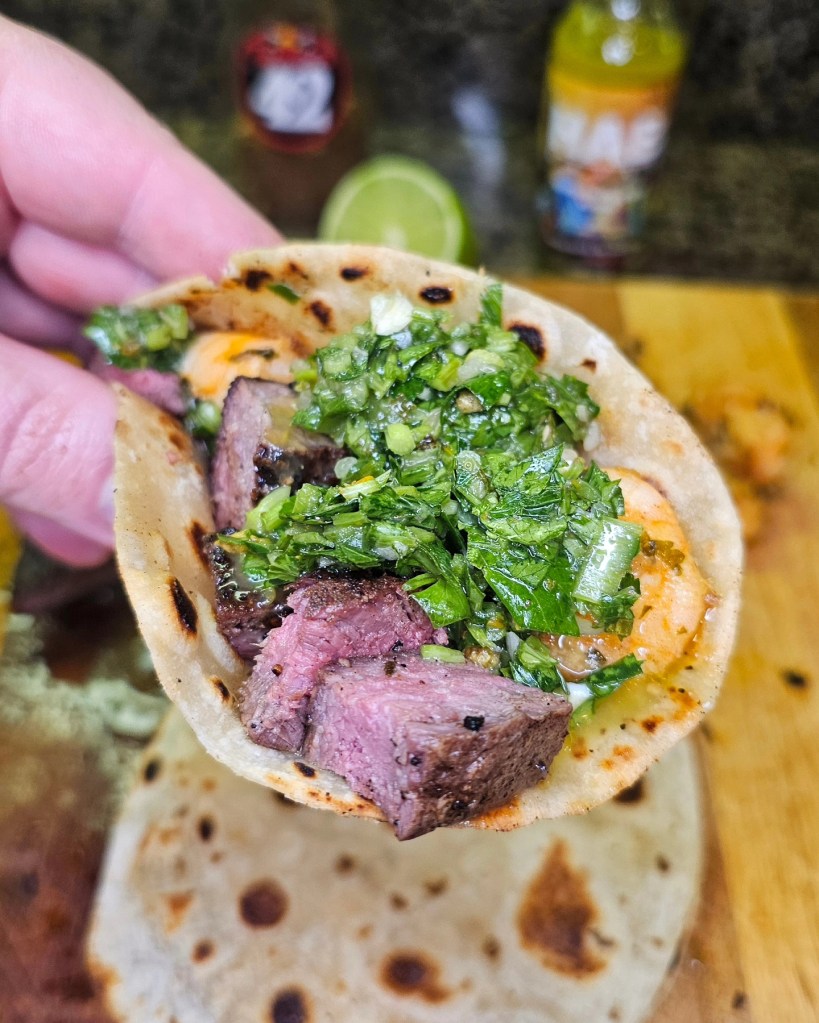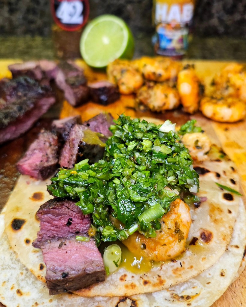 With everything ready, I combined it all in a toasted flour tortilla with steak, shrimp, Chimichurri sauce, and another drizzle of lime and @habsauce serrano tequila Verde 😋