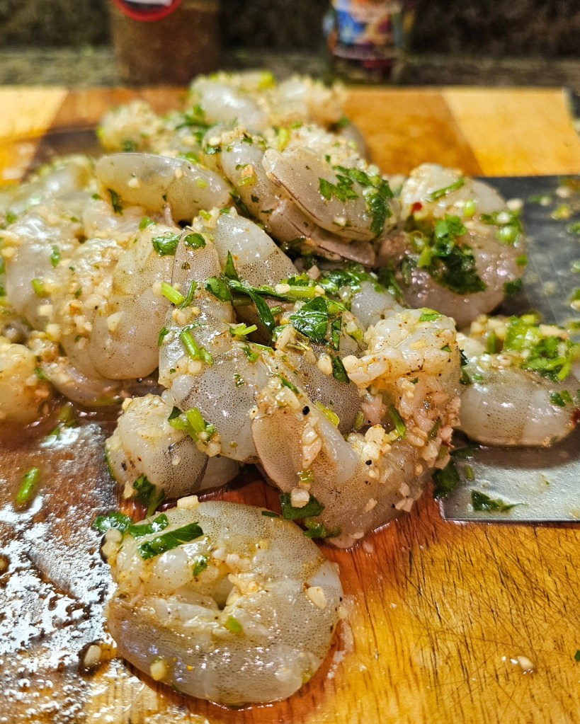 For the shrimp, I seasoned them with garlic, lemon, and some Chimichurri, then tossed them into a skillet and added some garlic butter.