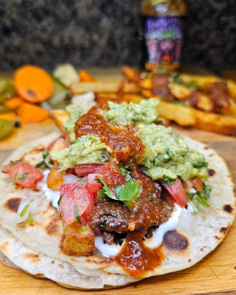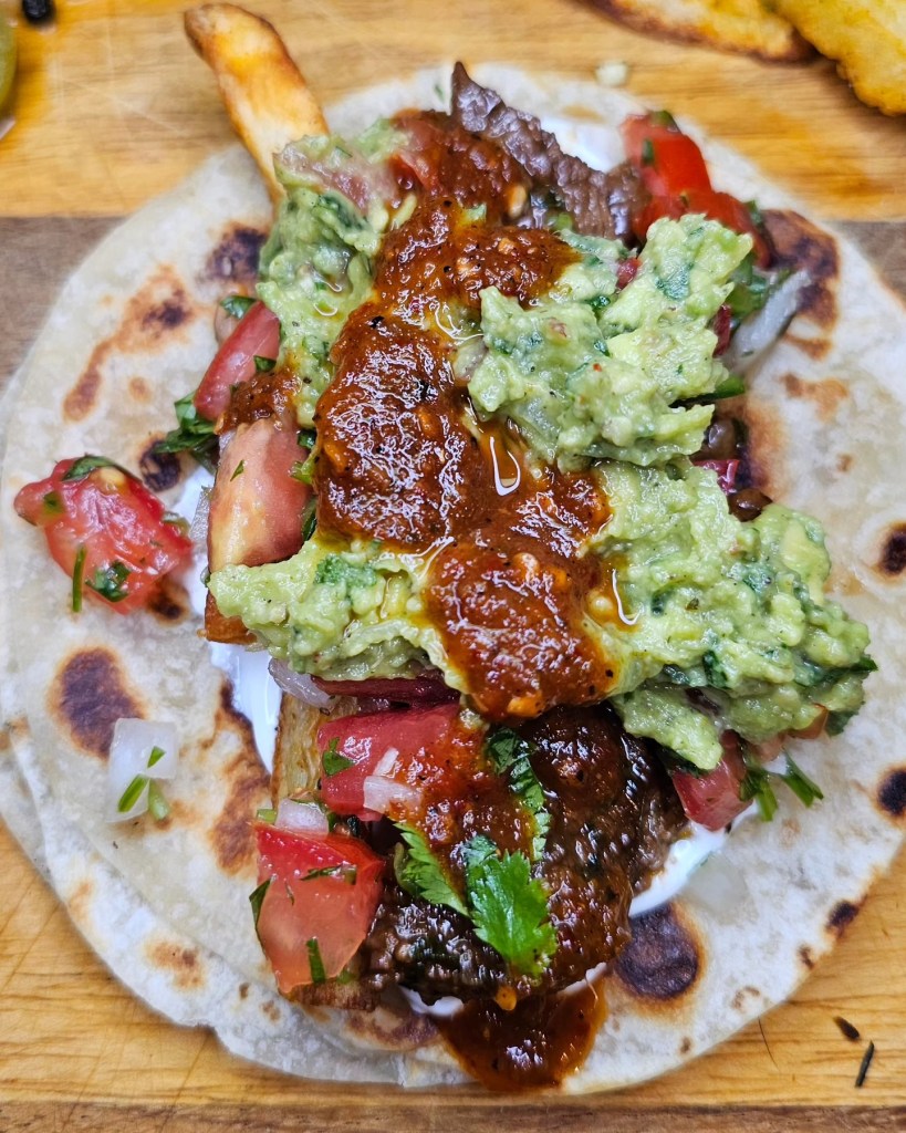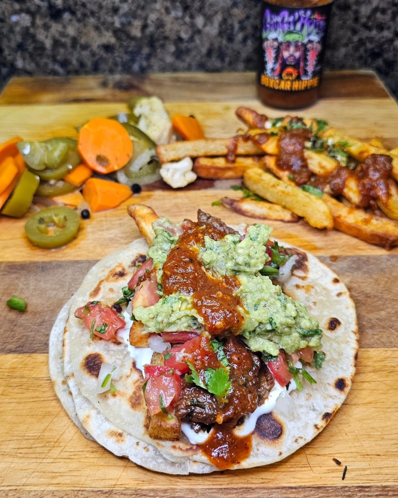 My own special blend marinated Carne asada and homemade seasoned French fries alongside pico de gallo and molcajete smashed guacamole with sour cream crammed into a few smaller Sonora style flour tortillas with a massive drizzling of @samsahouse Boxcar Hippie Hot Sauce. 🔥