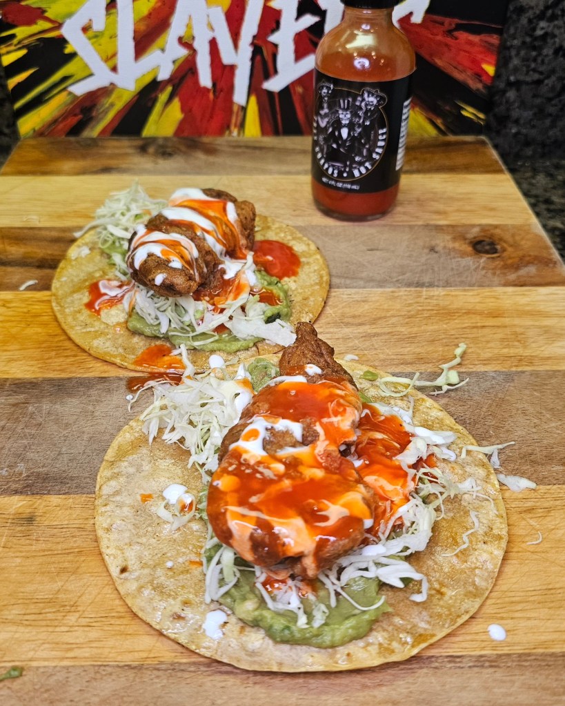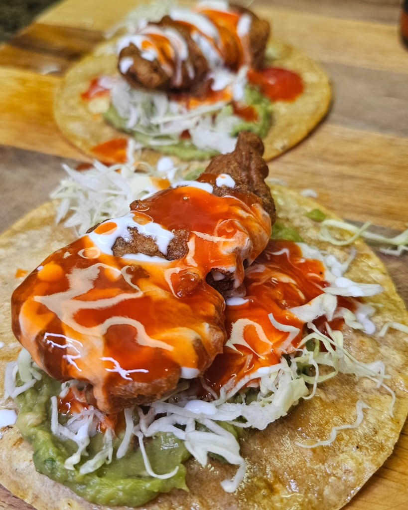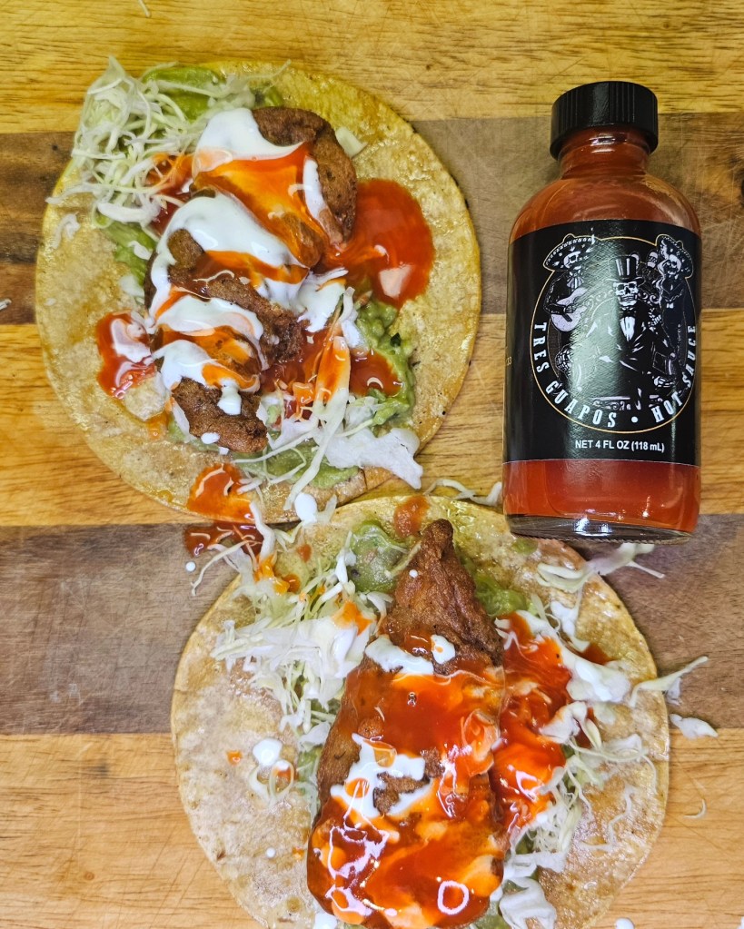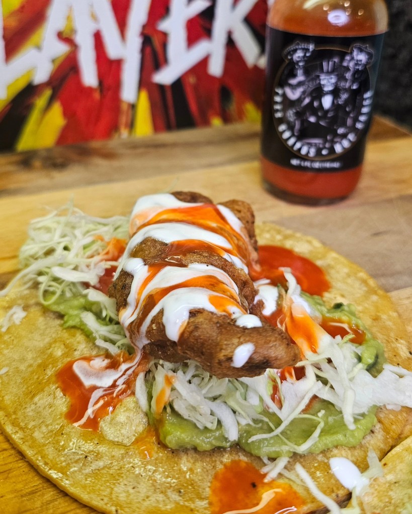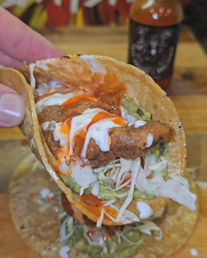 Crispy fried Alaskan pollock laying in a comfy bed of guacamole and shredded cabbage on a corn tortilla. Then, topped with Mexican crema and a very delicious drizzling of @tres.guapos smoked Fresno pepper hot sauce.