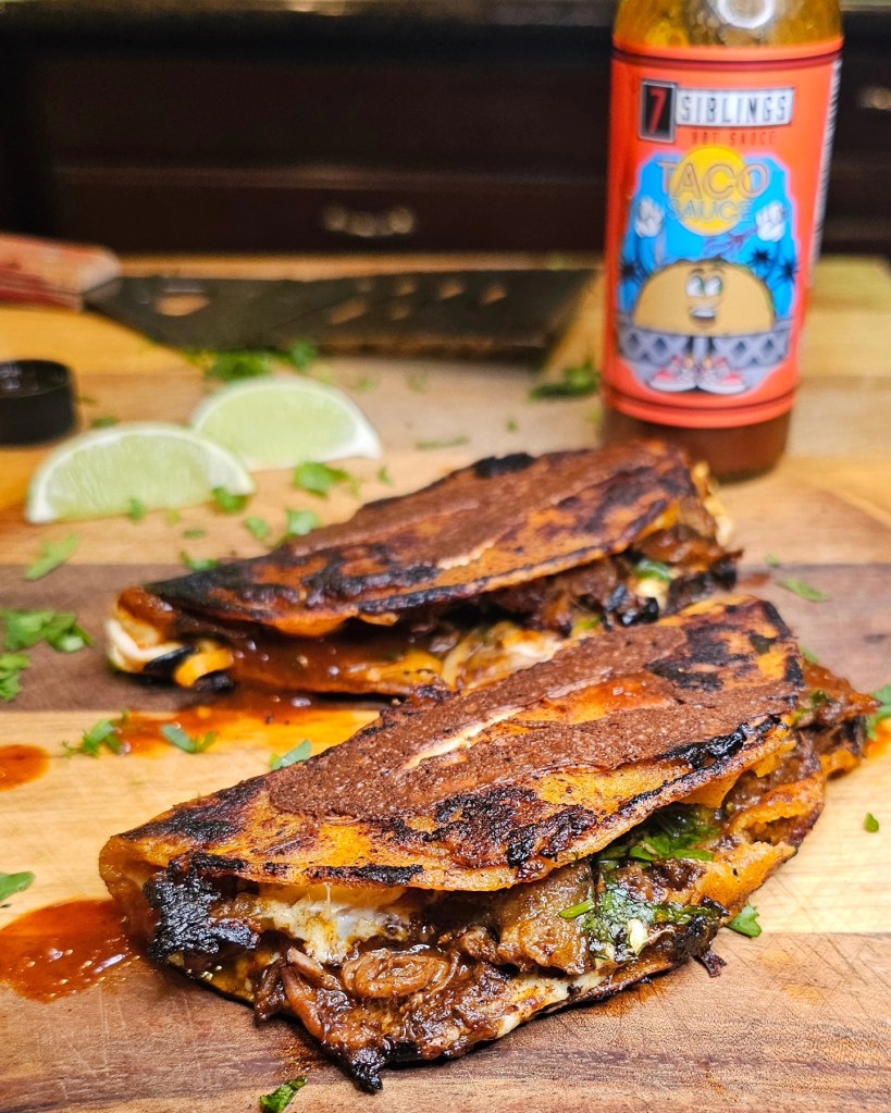 I added the meat to some @guerrerotortillas corn tortillas with melted @tiofranciscocheese queso oaxaca and then DRIZZLED IN the absolutely killer new Taco Sauce from @7siblingshotsauce! This sauce is super tasty but isn’t too hot and went perfect on this birria. NOT SHARING THESE