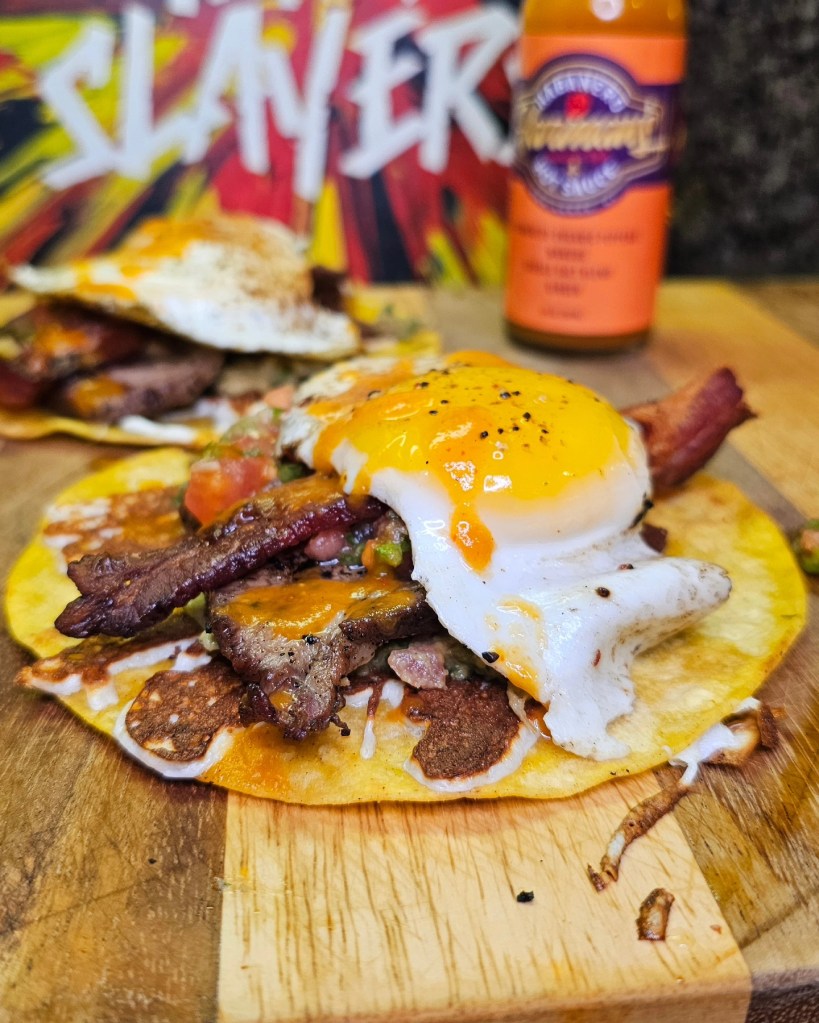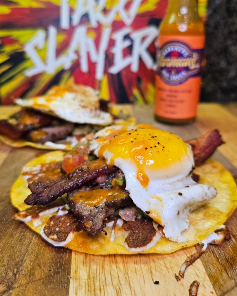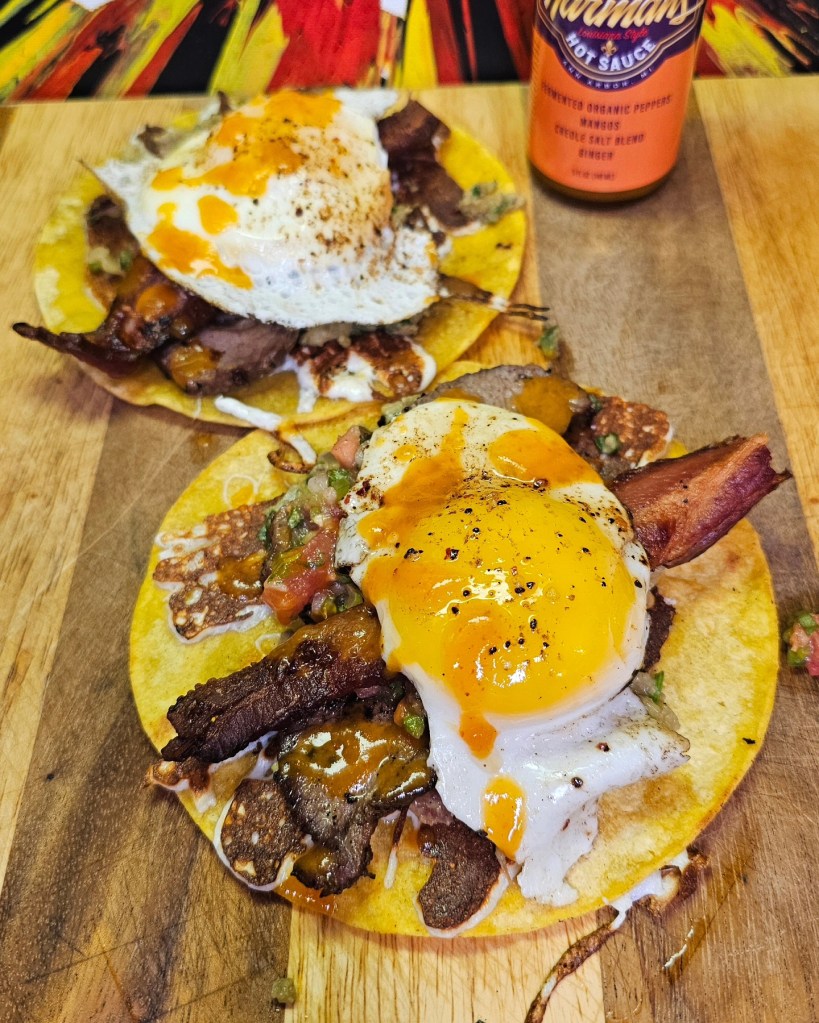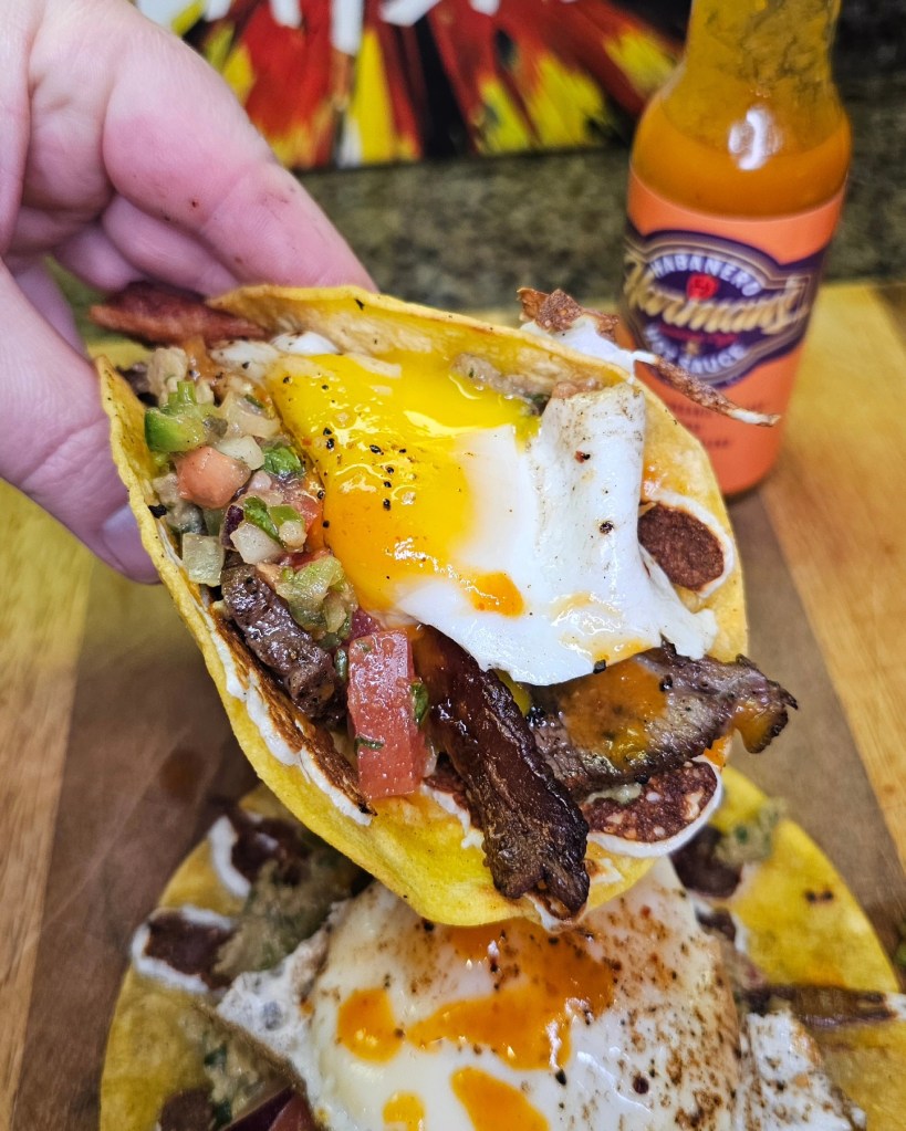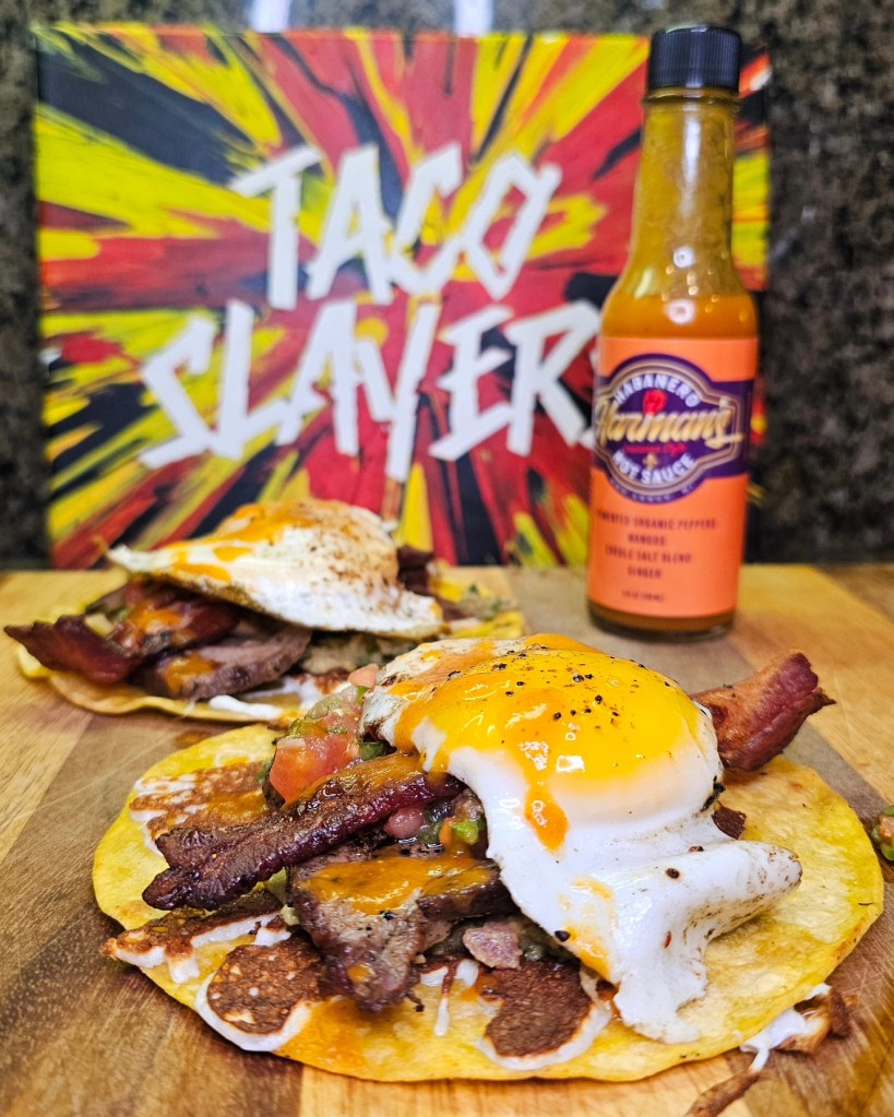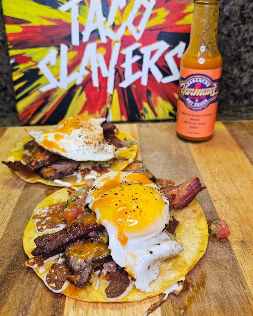 Started the day off with some pretty killer breakfast Tacos using bacon, eggs and the left over tritip. I coated a few corn tortillas with melted Oaxaca cheese the laid down a coat of guacamole followed by the beef and bacon and salsa. Lastly i added in an over easy egg with a huge drizzling or @habaneroharman ‘s Mango habanero sauce.