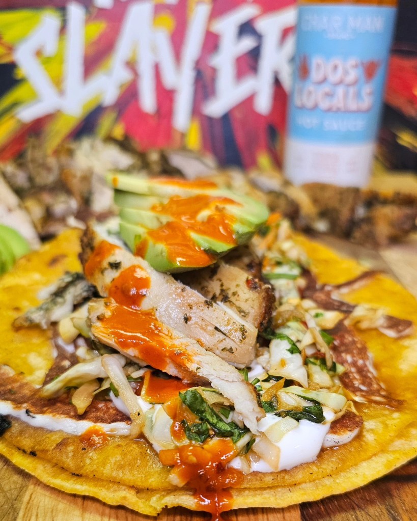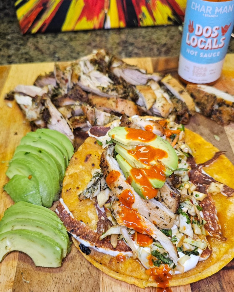 Next I added in some air fried Chimichurri Chicken from @brandingironranch and topped these tacos off with some avocado and @charmanbrand Dos Locals hot sauce.
