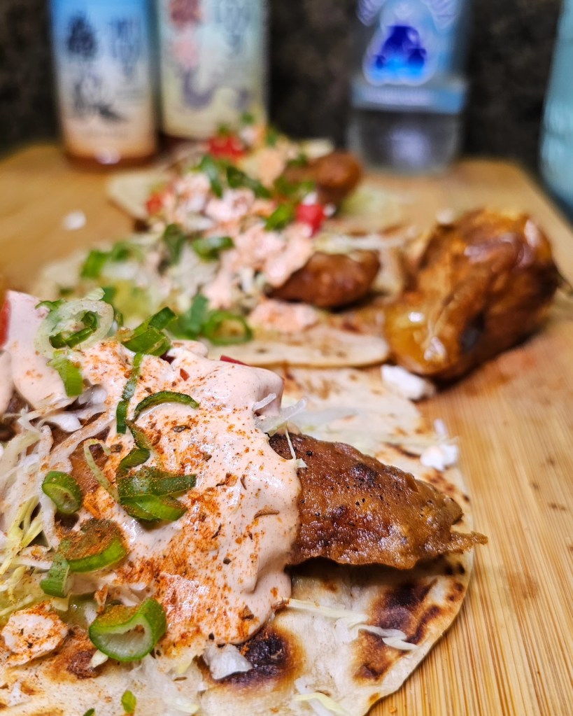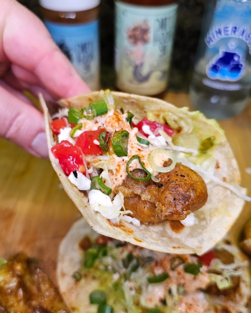 Once crispy, I added these fish to a guacamole laced flour tortill and topped them with shredded lettuce, tomato, queso fresco, and a big drizzling of the Dat’l Hook Ya cream sauce an then a topping of diced green onions. 💚