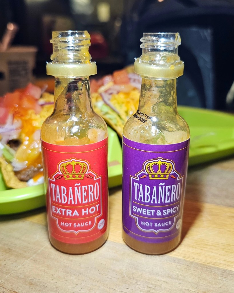 Fried corn tortillas from @missionfoodsus with a layer of sour cream, a few scoops of @sakarifarm saźon seasoned ground beef, lettuce, tomato, cheese, onion and a massive drizzle of these @tabanero hot sauces I picked up at for $1 at Walmart .