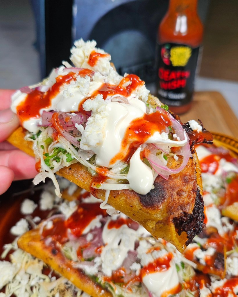 Next, I piled in a layer of guacamole, cilantro limed cabbage, pickled red onions, @tiofranciscocheese Mexican crema and queso fresco and then a massive drizzle of @elfantasticfuego Death Wish Hot Sauce.